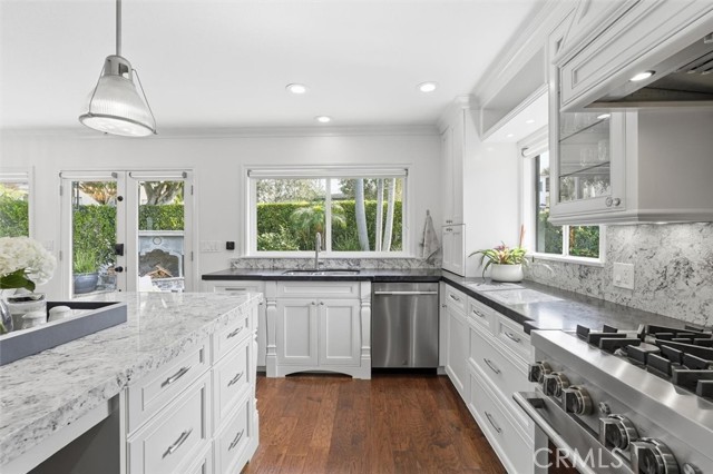 Tucked beneath a canopy of mature trees on one of the most coveted streets in Manhattan Beach’s Tree Section, this home offers a rare blend of timeless warmth and elevated coastal design. Set on a prime corner lot framed by established landscaping and privacy hedging, the property unfolds like a private retreat. Custom stonework, curated hardscape, and lush greenery create an arrival that feels intimate and intentional, from the inviting front entry to layered outdoor living spaces beyond. Inside, natural light pours through skylights and expansive windows, illuminating vaulted ceilings and open, airy living areas. Rich hardwood floors, refreshed travertine, crown molding, custom built-ins, and tailored window treatments refine the beach-inspired aesthetic. A rare and highly desirable feature: all bedrooms are located on the same level. The customized kitchen anchors the home with both beauty and function. Granite countertops, soft-close cabinetry, abundant storage, and updated appliances blend seamlessly into the open-concept layout, creating a natural gathering space for everyday living and entertaining. A stone fireplace and layered lighting add warmth and ambiance from day to night. Outdoors, a custom BBQ kitchen with prep sink, outdoor fireplace, refurbished decking, and a beautifully maintained Sundance spa create a private oasis for year-round enjoyment. The expansive upper-level lanai—water-sealed, freshly painted, and equipped with dedicated electrical—offers flexible space for lounging or future enhancements. A spacious loft adds versatility for a studio, office, guest retreat, or additional living space. Located within the highly regarded Manhattan Beach Unified School District and moments from parks, shops, dining, and the sand, this thoughtfully improved Tree Section residence embodies the essence of coastal living with enduring quality and understated luxury.