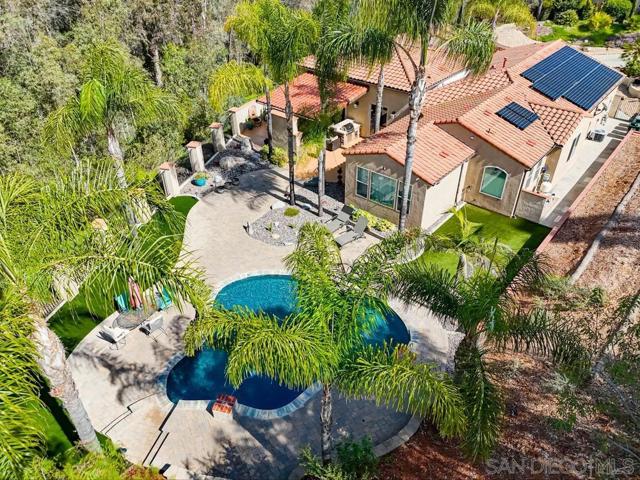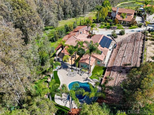 Welcome to the highly sought-after community of Lomas Serenas, perfectly positioned along the scenic trails of Lake Hodges where you can walk, run, bike, or ride horses and truly embrace the outdoors. Built in 2012, this beautifully maintained single-story home offers an exceptional open-concept floor plan designed for both everyday living and effortless entertaining. Step inside to a stunning Great Room with soaring 12-foot ceilings and a wall of sliding glass doors that seamlessly connect indoor and outdoor living. The expansive backyard is an entertainer’s dream, featuring a covered patio, outdoor fireplace, built-in BBQ, big screen TV, and a sparkling pool — all set against a peaceful, private backdrop. The gourmet kitchen has been freshly updated with refinished cabinetry and showcases a Viking stainless steel range and refrigerator, blending style and performance. The spacious primary suite overlooks the covered patio and pool, creating a relaxing retreat. Three additional bedrooms, a generous laundry room, and a finished garage with epoxy flooring and custom cabinetry provide comfort, storage, and functionality. Situated on an impressive 1.13-acre lot, this property offers rare privacy and space, creating a true connection with nature. Adding tremendous value, the home includes a fully paid 8,040-watt solar system with 24 LG panels, offering energy efficiency and long-term savings. This is Southern California living at its finest — private, refined, and designed to enjoy. Welcome to the highly sought-after community of Lomas Serenas, perfectly positioned along the scenic trails of Lake Hodges where you can walk, run, bike, or ride horses and truly embrace the outdoors. Built in 2012, this beautifully maintained single-story home offers an exceptional open-concept floor plan designed for both everyday living and effortless entertaining. Step inside to a stunning Great Room with soaring 12-foot ceilings and a wall of sliding glass doors that seamlessly connect indoor and outdoor living. The expansive backyard is an entertainer’s dream, featuring a covered patio, outdoor fireplace, built-in BBQ, big screen TV, and a sparkling pool — all set against a peaceful, private backdrop. The gourmet kitchen has been freshly updated with refinished cabinetry and showcases a Viking stainless steel range and refrigerator, blending style and performance. The spacious primary suite overlooks the covered patio and pool, creating a relaxing retreat. Three additional bedrooms, a generous laundry room, and a finished garage with epoxy flooring and custom cabinetry provide comfort, storage, and functionality. Situated on an impressive 1.13-acre lot, this property offers rare privacy and space, creating a true connection with nature. Adding tremendous value, the home includes a fully paid 8,040-watt solar system with 24 LG panels, offering energy efficiency and long-term savings. This is Southern California living at its finest — private, refined, and designed to enjoy.