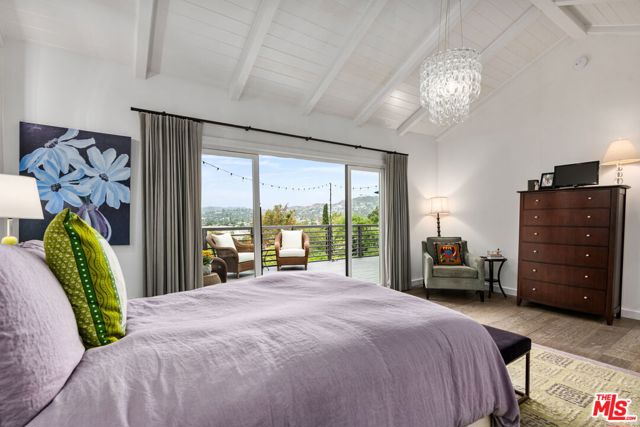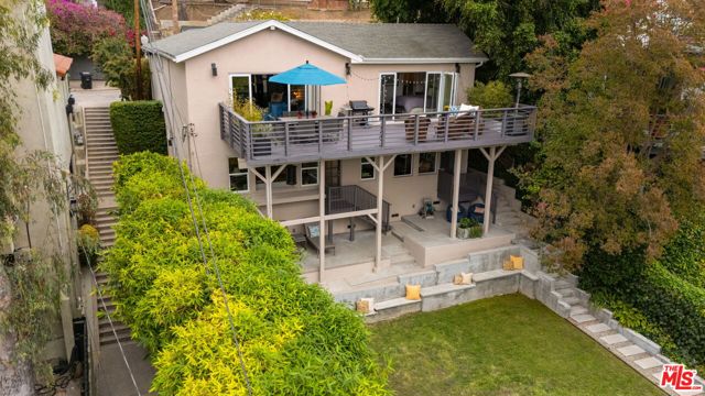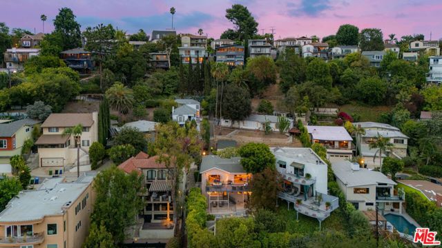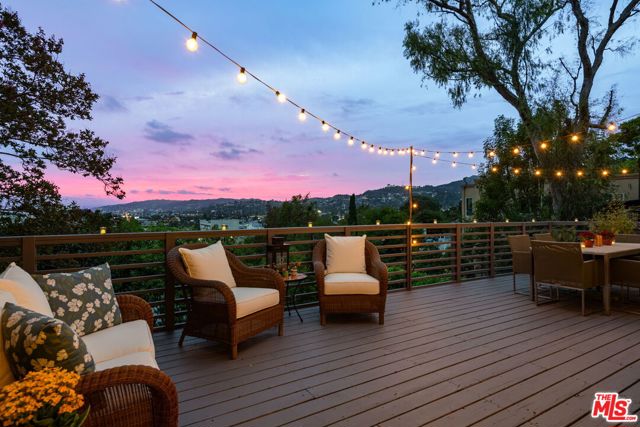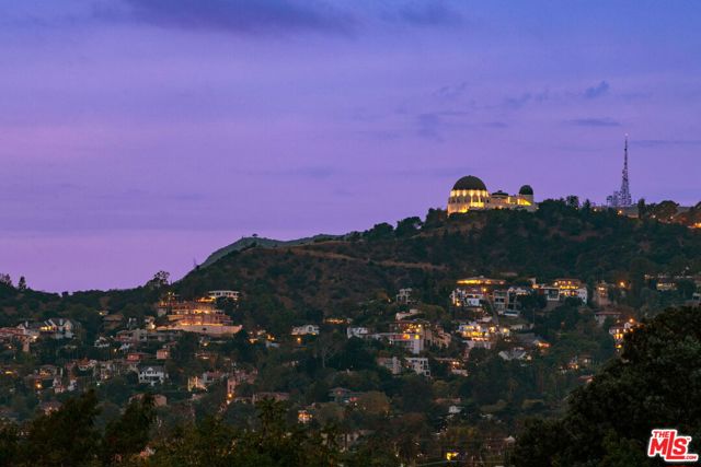 Welcome to this charming mid-century retreat in Franklin Hills, where architecture, light and landscape come together in effortless harmony. Soaring post-and-beam ceilings greet you upon entry, creating an airy atmosphere that feels both expansive and intimate. Folding glass walls blur the line between indoor and outdoor areas, leading to a sweeping deck that overlooks the city and serves as a natural extension of the living space. Panoramic views stretch to the iconic Griffith Observatory, across the hills and city lights, with sunsets that linger long past dusk. Thoughtfully reimagined with reverence for its architectural roots, the home has been remodeled for refined yet livable comfort. The kitchen and dining area, designed for connection and effortless gathering, flow seamlessly into the living room and out to the deck beyond. A spacious main-level en-suite offers exceptional flexibility, serving as a serene primary suite or a welcoming family room, complete with direct deck access for easy indoor-outdoor living. Downstairs, two generous en-suite bedrooms provide access to a rare, flat grassy yard, an unexpected luxury in the hills. This outdoor area offers ample room for entertaining, recreation, or relaxation amidst peaceful greenery. The landscape is as enchanting as the home itself: fragrant plumeria scents the air, vibrant crape myrtle adds seasonal color, and a stately magnolia lends year-round elegance. Turnkey yet filled with possibility, this residence is both sanctuary and canvas, perfect for a buyer who values architectural integrity while envisioning a home that evolves alongside them. Located near the storied Shakespeare Bridge and minutes to the beloved boutiques and cafes of Silver Lake and Los Feliz, this property provides hillside tranquility combined with vibrant city access, all within one of Los Angeles' most treasured enclaves.