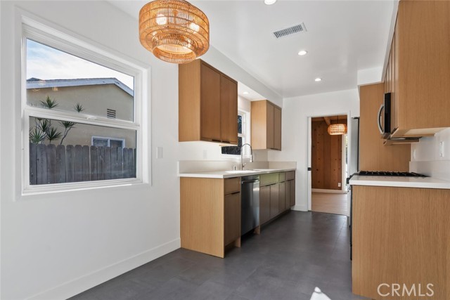 Magnificent ranch-style home in North Hills that blends timeless character with modern upgrades while preserving its original charm. The home features refinished original oak hardwood floors and vaulted ceilings in the formal living and dining rooms, creating an open and inviting feel. Extensively upgraded with permits, the property includes a new HVAC system, new roof, sewer line repair, new water heater, new double-pane vinyl windows and sliding door, as well as updated plumbing and light fixtures throughout the kitchen and bathrooms. Thoughtful finishes in earth-tone neutral colors give the home a warm and cohesive aesthetic. The functional floor plan offers three bedrooms plus a den that can easily be converted into an additional bedroom, along with two and a half bathrooms. A convenient half bathroom is located off the kitchen near the laundry area. The property is fully gated and includes a two-car garage and a generously sized backyard, ideal for entertaining or everyday enjoyment. Located within walking distance to shops and offering easy access to the 405 freeway, this home is truly move-in ready. Though modest in size, this home has it all—quality craftsmanship, permitted upgrades, and pride of ownership throughout.