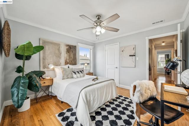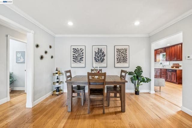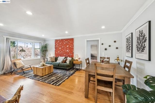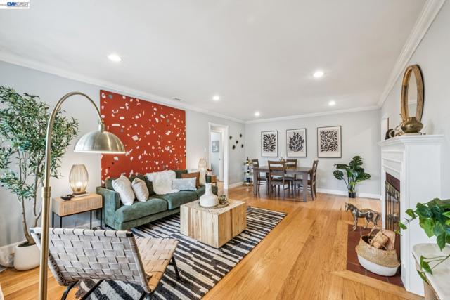 Wonderfully located between downtown Castro Valley and historic downtown Hayward, this upgraded 3BD/2BA single-level, mid-century home offers ease, comfort and convenience. The 1185 SQFT home lives large with an expansive backyard for great indoor/outdoor living. From the neighborly porch, step inside the sunny living room where you can relax with family and friends in front of the fireplace with a picture window view of the front garden. Recessed lighting, crown molding, and gorgeous hardwood floors span into the large eat-in kitchen. Stylishly renovated, the kitchen boasts a large dining area, newer appliances, custom cabinets, newer counters, and a sliding door to the backyard. Beautiful raised gardens surround the yard’s spacious flagstone patio and awning where you can entertain, unwind, or play in the shade. A large shed provides more storage. Back inside, both bathrooms have been tastefully upgraded - one with a shower and one with a shower over the tub. The home’s three bedrooms each have roomy closets, bright windows, crown molding, and ceiling fans. There’s interior access to the laundry area and the 1-car garage. Out your front door, find wonderful parks, the San Lorenzo Creek Trail, Japanese gardens, Castro Valley BART, respected schools, & charming downtown Hayward.