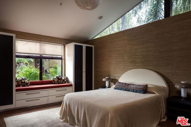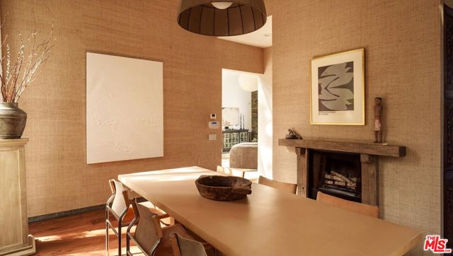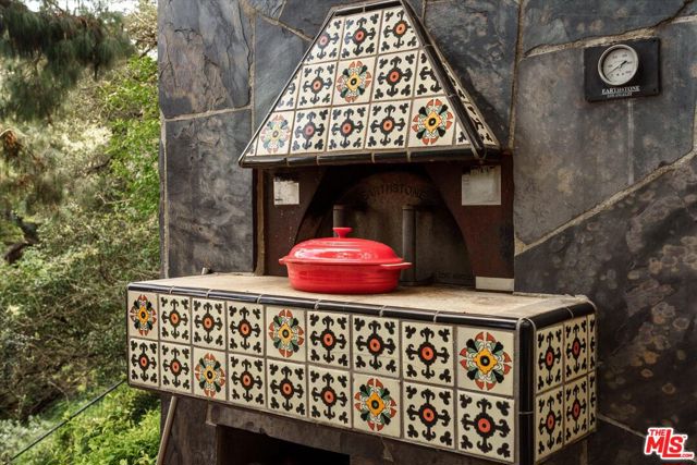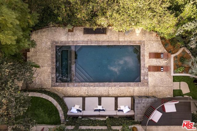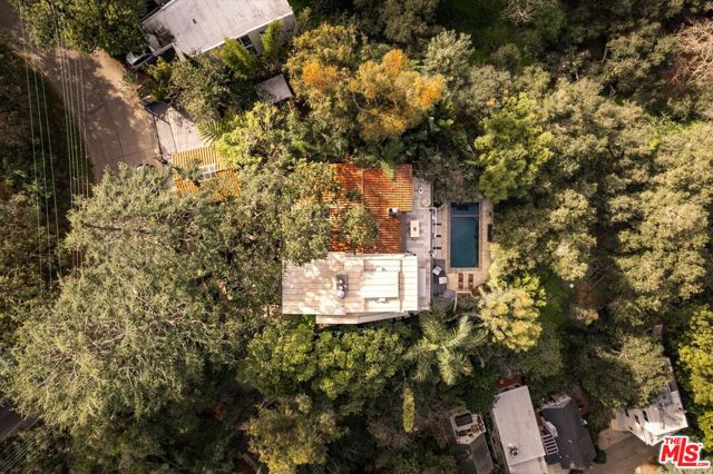 A striking architectural retreat perched at the top of Laurel Canyon, 8882 Lookout Mountain sits across four contiguous lots surrounded by mature trees, offering exceptional privacy and sweeping canyon-to-mountain views. Upon entering you are greeted with a dramatic living room where indoors and outdoors merge seamlessly, anchored by a mature tree growing through the space, and framed by skylights that filter soft light through its canopy. Floor-to-ceiling steel windows capture expansive views throughout. The chef's kitchen features stainless counters and island, custom cabinetry, and premium appliances, flowing effortlessly into the formal dining room with fireplace. Two additional bedrooms complete this level, one currently styled as a den. The primary suite occupies its own level, creating a true private retreat with a fireplace, walk-in closet, spa bath, and a retractable soaring ceiling. The lower level offers a bedroom, bath, kitchenette, sitting area, and gym ideal for guests, creative studio use, or extended living. The outdoor spaces are equally transporting, with layered decks and patios, an outdoor lounge complete with a pizza oven, and a pool with built-in spa, a sauna, and cold plunge, all set against breathtaking canyon views. With a separate garage, four total parking spaces, abundant natural light, and bold architectural presence, this is a rare hillside compound where design, privacy, and nature converge.