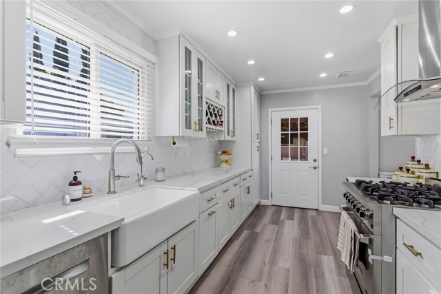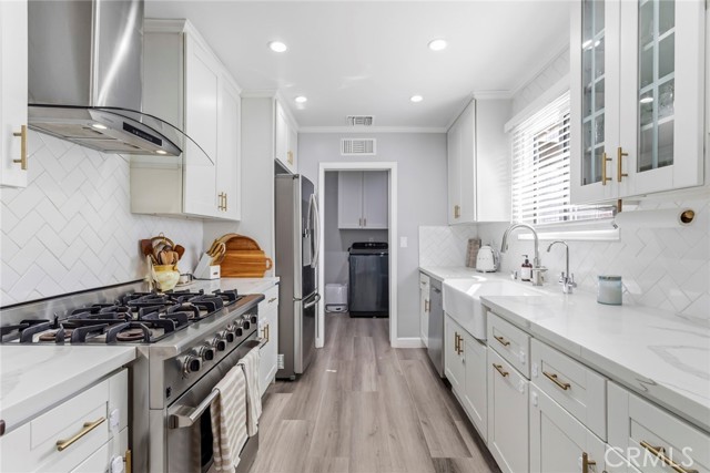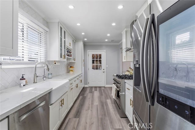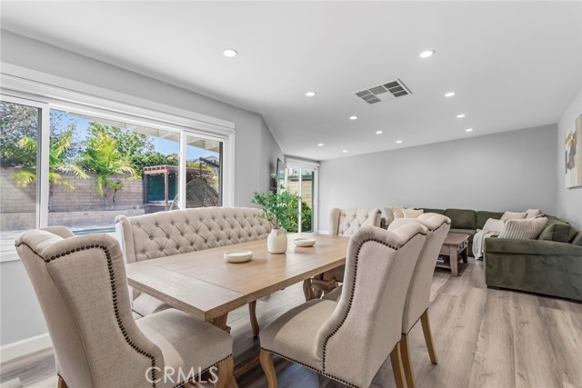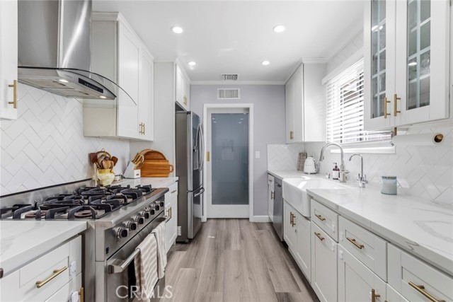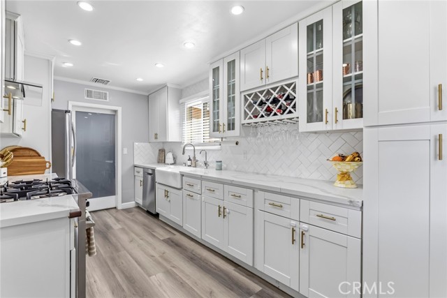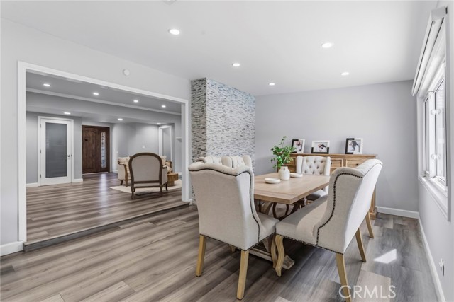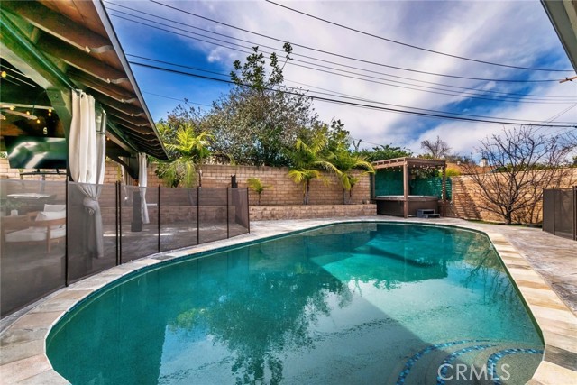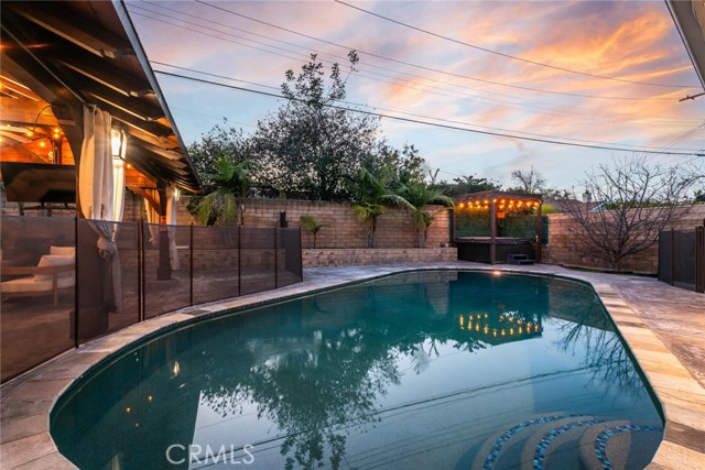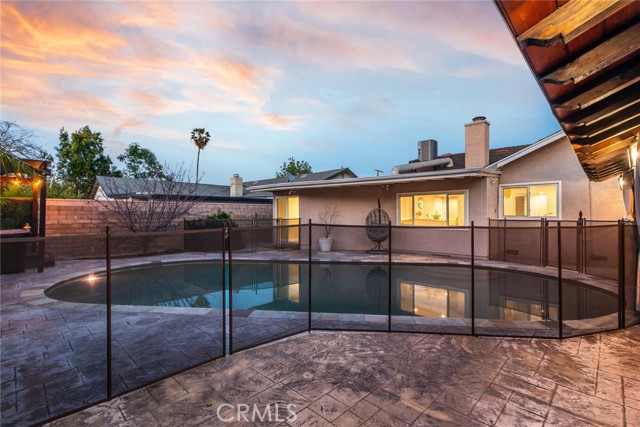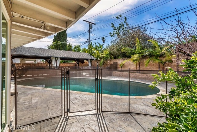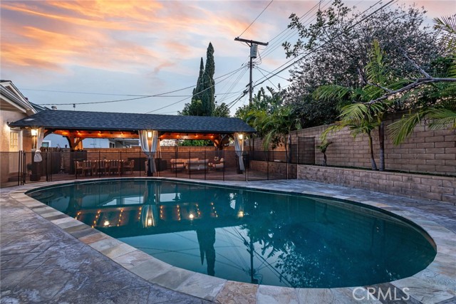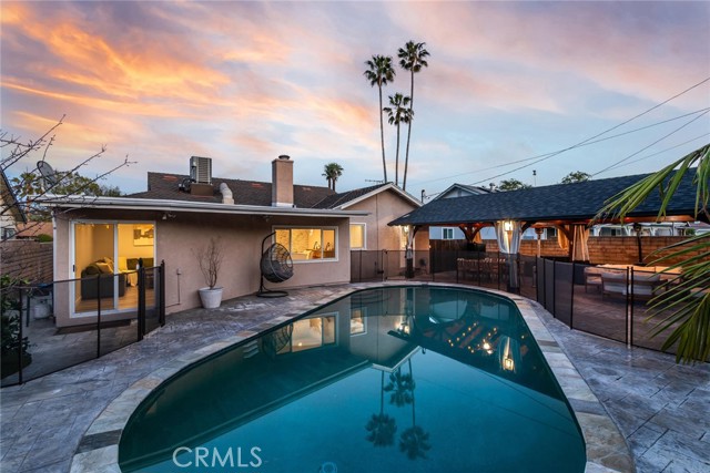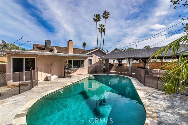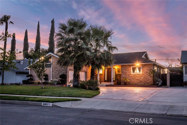Welcome to this exquisitely remodeled pool residence, gracefully positioned along a serene, tree-lined street in North Hills West. From the moment you arrive, the home’s striking curb appeal makes a lasting impression, featuring a stacked stone façade, an expansive brick and concrete driveway, and a charming front porch framed by an oversized wood entry door. Inside, approximately 1,800 square feet of thoughtfully designed living space unfolds with a formal entry, spacious family room, elegant living and dining areas, three bedrooms, and three bathrooms. Wide-plank wood-look flooring, new interior doors, inviting paint selections, recessed lighting, custom built-ins, and designer fixtures create a refined yet inviting space, while abundant windows flood the space in natural light. The expanded kitchen is both stylish and functional, offering an abundance of white shaker cabinetry with custom detailing including a built-in wine rack and glass display, quartz countertops, under-cabinet lighting, stainless steel appliances, a farmhouse sink, and a chevron-pattern subway tile backsplash. A charming breakfast nook provides the perfect setting for casual dining. The formal dining area enjoys beautiful views of the backyard, while the living room is anchored by a beautifully appointed fireplace with custom tile and mantel. The primary suite offers generous closet space with mirrored closet doors and a remodeled private bath complete with a walk-in shower and quartz vanity with vessel sink. Secondary bedrooms are well proportioned with ample storage. The updated hall bath showcases a white oak vanity with quartz countertops and a tub/shower combination with custom tile work. Modern amenities include a two-car attached garage, newer HVAC system, tankless water heater, dedicated pool bath, and an indoor laundry room with storage. Step outside to your private retreat, featuring a sparkling pool, an above ground spa, and an expansive custom patio designed for effortless entertaining and large gatherings. Ideally located near schools, shopping, and convenient freeway access!