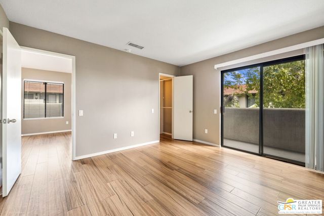 Wow! Central Palm Springs, resort amenities, and move-in ready appeal welcome you to your getaway at gated Casa Verde. Vaulted ceilings and abundant natural light fill the main living space, while this desirable north and east facing upstairs end unit offers mountain and greenbelt views from the front patio, perfect for relaxing or sunset unwinding. Handsome engineered hardwood flooring runs underfoot, and the updated bath features a tiled shower with glass enclosure and custom vanity. The bedroom serves as a private retreat with its own balcony and generous walk-in closet. Quiet interior location ensures no street noise, just peaceful desert living. Residents enjoy two resort style pools and spas, two tennis courts, and beautifully maintained grounds, all just moments from the dining, design, and nightlife along Palm Canyon Drive, with low HOA completing the package for the ultimate lock-and-leave Palm Springs retreat.