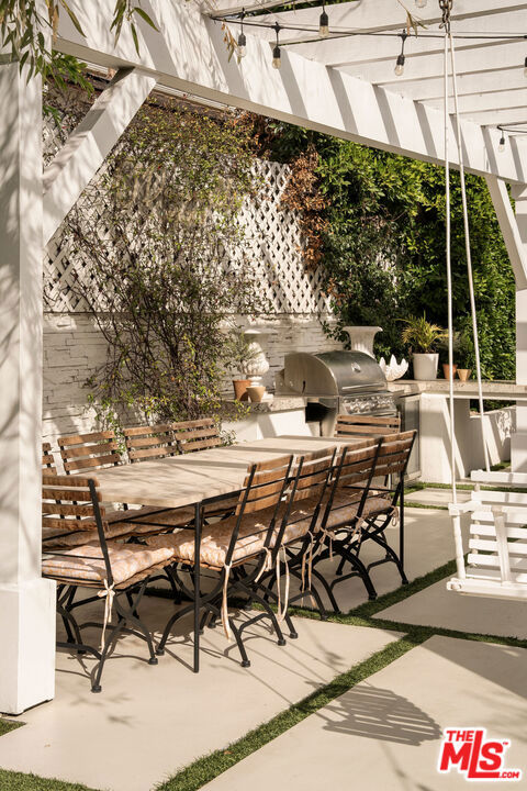 Private designer 3 Bed / 3 Bath compound on corner lot in desirable Del Rey. Set behind mature hedges and gate, enter the home through a Dutch front door into an inviting, sunlit living and dining space, highlighted by a beautiful bay window with built-in banquette seating. The meticulously designed kitchen features a large island and elegant finishes, with French doors that open to a fully equipped outdoor kitchen and dining area. Designed for effortless indoor-outdoor living, this retreat offers multiple zones for alfresco dining and entertaining. Additional features include a fire pit lounge, hot tub, deck, and putting green. The 2 bed, 2 bath main house includes a primary suite with a luxurious bath, thoughtfully designed with refined, elegant finishes. The guest bedroom and bathroom have also been beautifully appointed with timeless touches. The detached studio has a kitchenette and bathroom, offering exceptional versatility as a bonus space, home office, creative studio, or gym. A private sanctuary and an entertainer's dream, this compound is located in one of the area's most sought-after neighborhoods. Walkable to local favorites like Rainbow Acres, Hatchet Hall, Minotti's, and an array of beloved restaurants, cafs, and parks, this special turnkey home offers the very best of Westside living.
