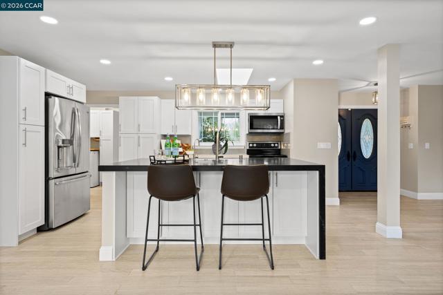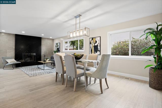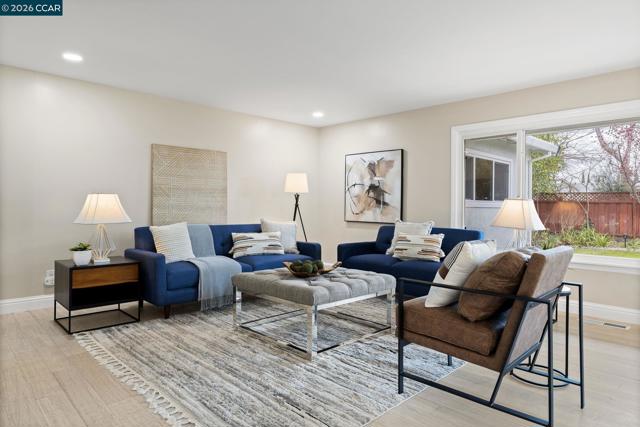 Completely updated & redesigned, this single-story home offers modern finishes, open living & a spacious backyard retreat in a well-established Concord neighborhood near shopping. A bright great room with wide-plank flooring, recessed lighting & oversized windows flows seamlessly into the dining area & remodeled kitchen, creating an expansive open-concept layout. The kitchen features a large island with dark stone counters & bar seating, white shaker cabinets, stainless steel appliances, farmhouse sink & abundant storage. Expansive bi-fold glass doors fully retract to the covered patio for true indoor-outdoor living. A separate family room showcases a dramatic floor-to-ceiling fireplace with sleek black slab surround. The primary suite offers backyard views, walk-in closet & an updated bath with dual vanities & tiled walk-in shower. Three additional bedrooms offer flexibility, with a remodeled hall bath featuring dual sinks, jetted tub & glass shower. A dedicated laundry room with storage & an adjacent full bath. The private backyard includes a covered patio, expansive lawn, mature landscaping with citrus trees & wide side yard. Close to shopping, 12 years of nearby schools including two established private high schools, BART & commuter routes.
