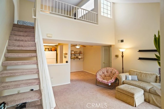 Beautiful One Bedroom and One Bath Plus Loft in Siena Villas Located in Valencia that is FHA and VA Approved. Welcome to this desirable upstairs unit in the sought-after Siena Villas community. This light-filled condo features soaring high ceilings and a spacious open-concept living room with a charming tiled fireplace and custom paint throughout. Enjoy abundant natural light and access to a private balcony, perfect for relaxing or entertaining. The home offers a separate dining area and a well-appointed kitchen that opens to the living room, complete with white tiled countertops, white cabinetry, and stainless steel appliances. The large primary bedroom includes access to a private patio, an attached bathroom with vanity, a shower/tub combination, and a walk-in closet with custom organizers. Upstairs, the expansive loft features its own closet with custom organizers and can easily be used as a second bedroom, home office, workout area, or playroom. Additional highlights include underground parking and access to community amenities such as a pool and spa. Conveniently located near the Valencia Mall, Award winning schools and Summit walking trails, farmers market, shopping, schools, and easy freeway access. (water and trash covered by HOA)