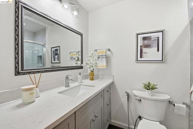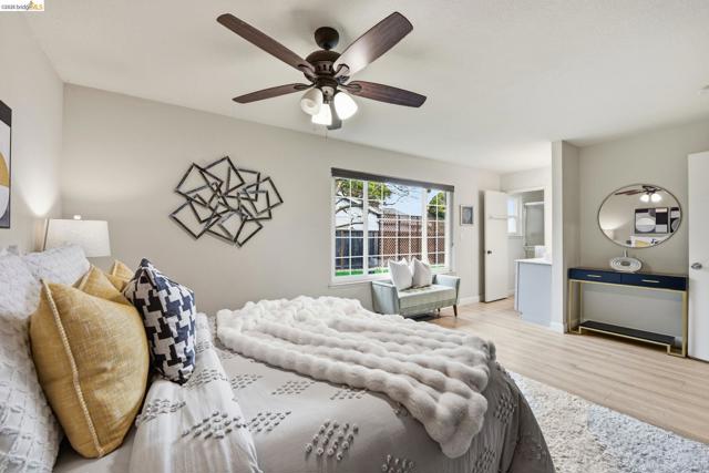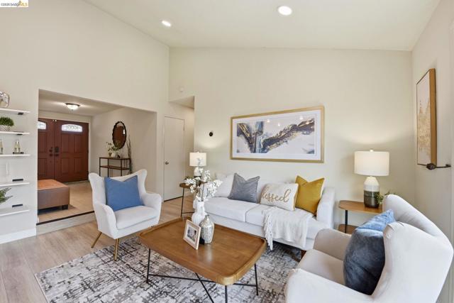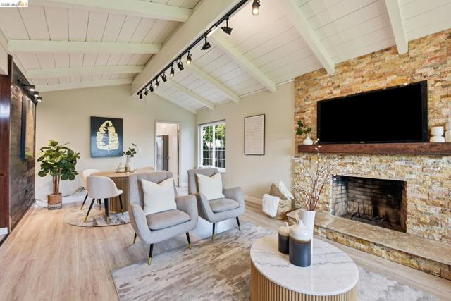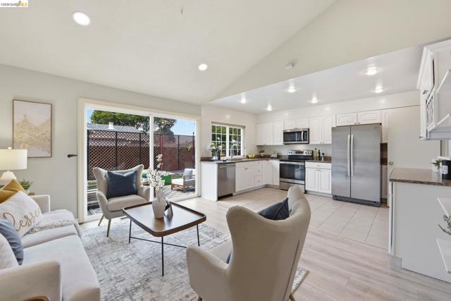 Beautiful East-facing 4BD/2BA single-story home in the heart of Union City. Spacious corner lot (7,100 sq ft) and zoned for top-rated Delaine Eastin Elementary. Double doors open to a bright, open floor plan with vaulted ceilings and abundant natural light. Living room features a striking fireplace with a modern ledger stone façade, creating a warm focal point for gatherings. Refreshed kitchen includes refinished cabinetry, updated hardware, an over-the-range microwave, energy-efficient dishwasher, and a practical layout ideal for daily living. Interior improvements include high-quality laminate flooring, custom bedroom closet systems and blinds, recessed lighting, and fresh paint. Bathrooms have been tastefully enhanced, including a fully remodeled hall bath and an updated primary vanity with contemporary fixtures. Beautifully landscaped backyard featuring premium Trex deck perfect for entertaining, new sod, upgraded irrigation, and mature fruit trees including persimmon, plum, and lemon. Conveniently located near I-880, the San Mateo and Dumbarton Bridges, Coyote Hills Regional Park, Alameda Creek Trail and Union Landing, this home is move-in-ready!