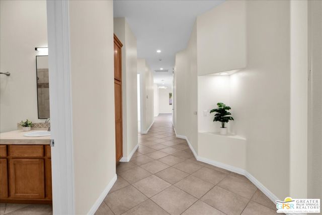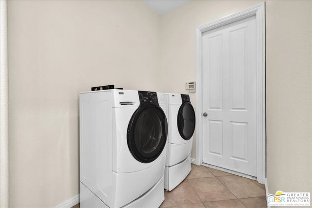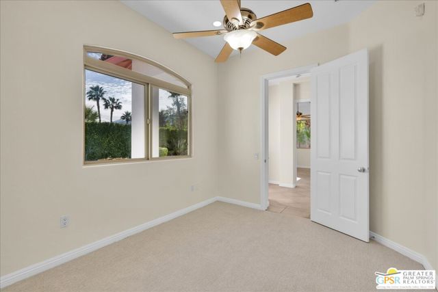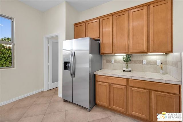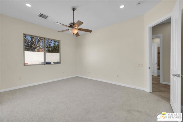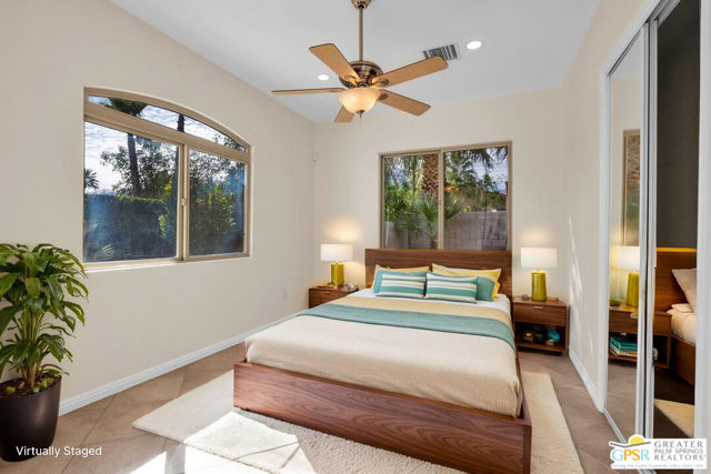 Welcome to Desert Park Estates and easy Palm Springs living. With 10-foot ceilings, 8-foot doors, and abundant windows throughout, this home feels bright, open, and connected to the outdoors. The gated, fully walled yard offers great privacy, with a courtyard-style setting, newly tiled pool and raised spa, fresh paint, and updated desert landscaping. The great room with fireplace opens right to the backyard, and the kitchen features a breakfast bar and plenty of storage. The primary suite includes a soaking tub, tiled shower, walk-in closet, and its own private patio. Two guest bedrooms plus a newly built fourth bedroom (perfect for an office or den) give you flexible space. With 2.5 baths, a separate laundry room, air-conditioned three-car garage, and solar (14 owned + 34 leased; buyer to assume $203/month lease), this home is comfortable, private, and ready to enjoy.