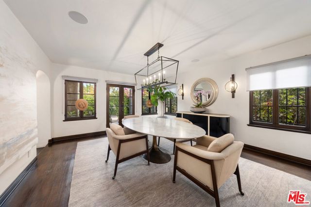 A rare opportunity to own a piece of Los Angeles history, this Spanish Revival residence in Hancock Park was originally designed by noted architect Donald Uhl. Blending timeless 1920s character with modern upgrades, the home has been reimagined to meet today's lifestyle while honoring its architectural roots. Step through the arched entryway and be greeted by original tile floors and a sweeping wrought-iron staircase, setting the tone for the craftsmanship found throughout. Natural light fills the formal dining room, which opens to a private courtyard featuring an outdoor fireplace and fountain, perfect for intimate gatherings. The gourmet kitchen is equipped with top-tier Miele appliances, including a wine fridge, steam combi oven, and built-in coffee system, making it both functional and stylish. A versatile den or office sits just off the entry, offering flexibility for work or relaxation. Upstairs, three spacious ensuite bedrooms provide comfort and privacy. The primary suite includes access to a private balcony, extending the living space outdoors. The grounds are beautifully landscaped with mature plantings, including camellias, coral trees, palms, and roses, all enhanced by thoughtfully designed exterior lighting. With a full home sound system, Wi-Fi integration, security, and CCTV, this residence seamlessly merges historic charm with the conveniences of contemporary living.
