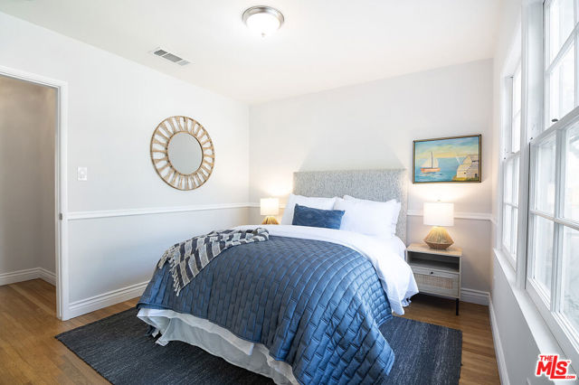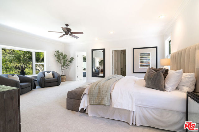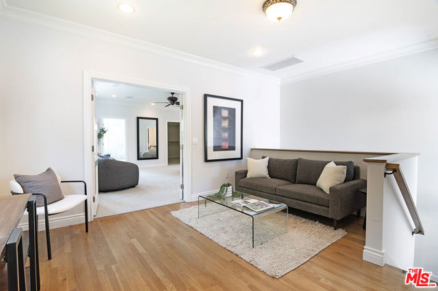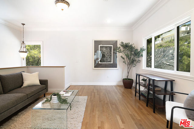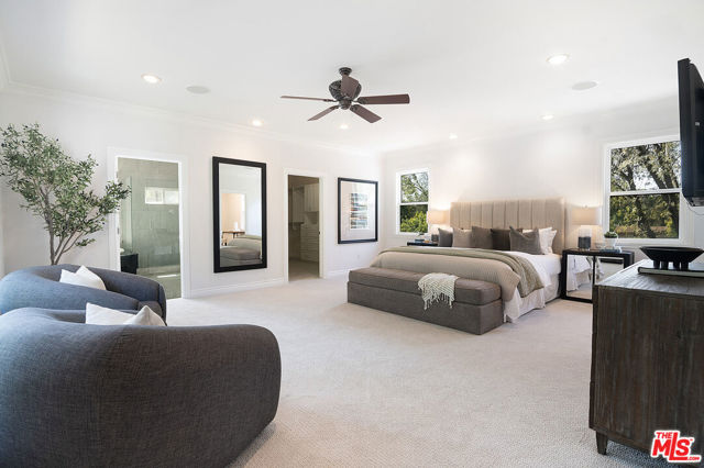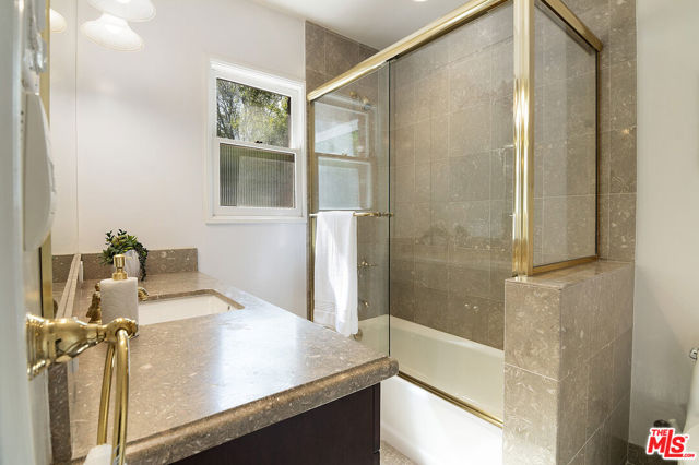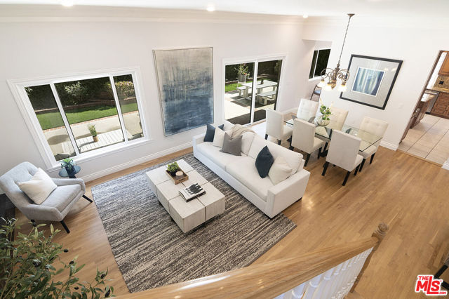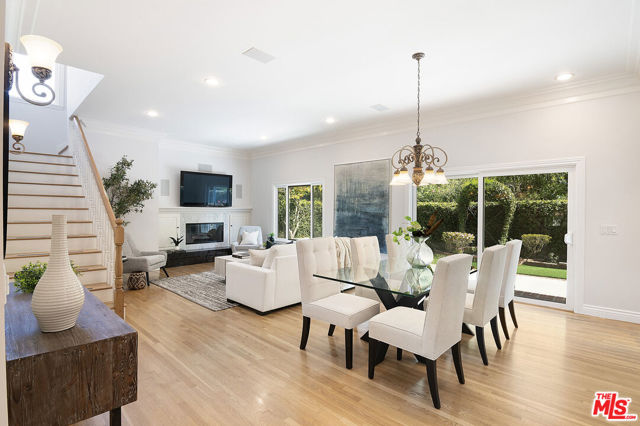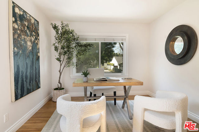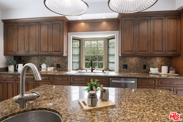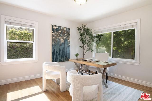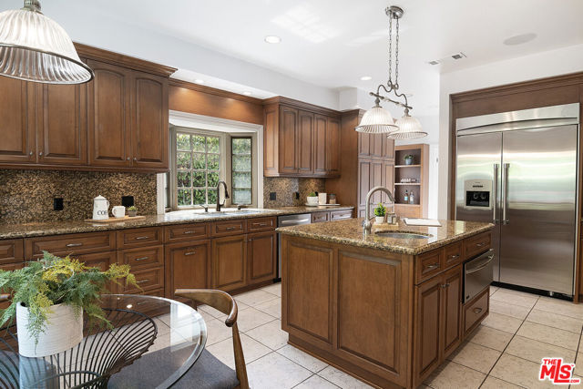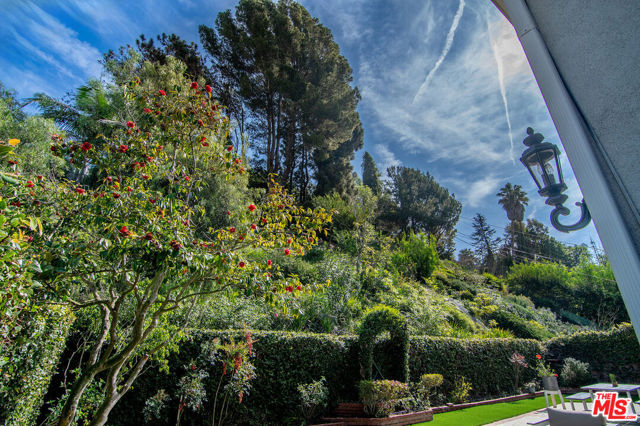 This single-family residence graces a tree-lined stretch of Castle Heights Avenue in the coveted Beverlywood Homes Association. Spanning 2,813 square feet on a generous 10,200-square-foot lot, it delivers a compelling blend of classic appeal and contemporary flow. The traditional faade extends a warm welcome from the street. Step inside to a distinguished living room where built-in cabinetry, a working fireplace, and skylight create an airy, light-filled introduction to the home. The kitchen commands attention with its impressive scale and thoughtful design: abundant counter space and cabinetry, an extra-large island featuring a second sink, a powerful 6-burner chef's range with grill and double oven tucked into a cabinetry nook with hood vent, a warming drawer, a bar fridge, and a relaxed eat-in area that draws the eye to the serene rear grounds. The dining room and family room unite in an expansive, high-ceilinged space wired for surround sound, where the layout feels naturally inviting and opens directly to the backyardperfect for seamless indoor-outdoor living and entertaining. Upstairs, the master suite unfolds as a private sanctuary with a dedicated lounge and separate office, plus a spacious bedroom that enjoys tranquil views across the backyard and lush hillside. A generously proportioned walk-in closet offers custom built-ins, while the master bath provides spa-level comfort: separate shower, jetted tub, double vanity, heated floors, and towel warmer. Downstairs, one wing accommodates two bedrooms sharing a full bath and heated floors, while the opposite wing presents a versatile fourth bedroomideal as a guest suite or officewith street-facing views and its own attached three-quarter bath. The backyard offers rare outdoor privacy: a broad patio flows to a turf area, all embraced by a substantial, lush hillside of dense greenery that ensures remarkable seclusion and calm. A thoughtfully updated home with genuine scale and character, quietly positioned in one of LA's most sought after neighborhoods.