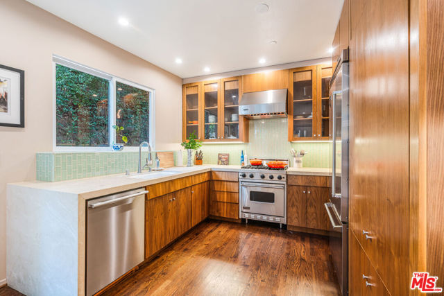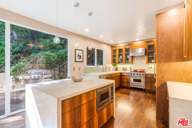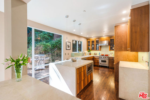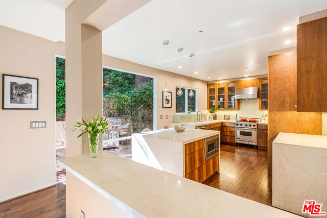 Discover this private and gated retreat nestled amidst the verdant landscapes of Laurel Canyon, located within the award winning Blue Ribbon Wonderland school district on a quiet non through street . This quality built architectural residence combines contemporary sophistication with peaceful serenity and offers the ideal haven from the urban life yet is just minutes from the dining , shopping and nightlife of West Hollywood , Beverly Hills and Sunset Plaza . Natural light abounds from the high ceilings and gorgeous window lines and its open spaces flow seamlessly from the inviting indoors to the spacious outdoors. The main level boasts an open- concept living room, dining room and kitchen, designed to feel both expansive and intimate. Soaring cathedral ceilings create a sense of grandeur, while oversized windows frame views of mature trees , filling the space with natural light and a magical , tree - house - like ambience. The gourmet chefs kitchen is a culinary enthusiasts delight. Outfitted with premium appliances, sleek counter tops, abundant storage and a large center island, it is ideal for hosting gatherings or enjoying intimate family dinners. If the outdoors is where you prefer to gather, then the outdoor BBQ and dining area is ready for your entertaining . After dinner, step into your lush private yard and dip into the large spa that doubles as a plunge pool, or siimply lounge in your lazy hammock that is engrossed by lush greenery. This home offers 3 generous bedrooms and 3 bathrooms, plus office , studio , or gym. Two of the bedrooms are accompanied by spa-inspired en-suite baths and walk in closets. The primary suite spans the entire top floor and is enhanced by an adjoining space ideal for mediation, yoga, exercise, studio or home office. Steps from the primary, you have your very own rooftop deck, perfect for morning coffee or evening wine and star gazing The tranquil, gated property is situated in prime Laurel Canyon offering the dual benefit of seclusion and easy access to Los Angeles's vibrant culture.
