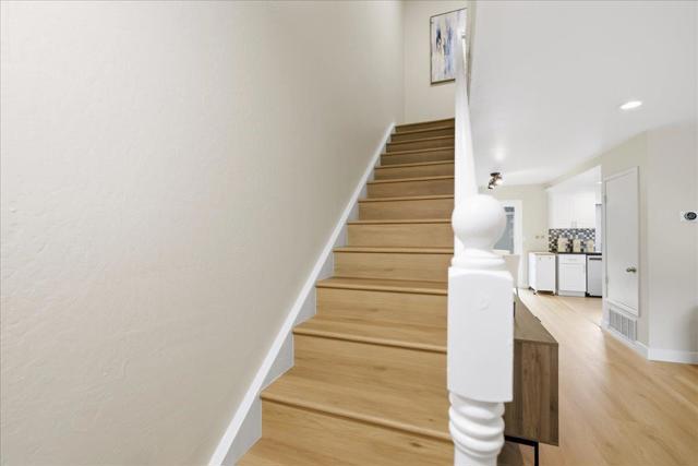 Move-in ready 3-bedroom, 2.5-bath townhouse in the desirable Isle Cove community, offering 1,330 sq ft of bright, open living space. Recently remodeled with new flooring, fresh interior paint, recessed lighting, quartz countertops, custom cabinetry, stainless steel appliances, and double-pane Milgard windows. All bedrooms are upstairs, including a spacious primary suite with double vanity. Guest bedrooms enjoy peaceful water views. The townhouse includes a detached side-by-side two-car garage. HOA covers water, sewer, garbage, exterior structure, roof, and fire insurance, and offers amenities such as a pool, clubhouse, tennis courts, and playground. No flood insurance required. Prime location near lagoon trails, walk to Foster City Elementary School and Edgewater Plaza, with easy access to Highways 101 & 92 and nearby shopping including Costco, Ranch 99, and Target.