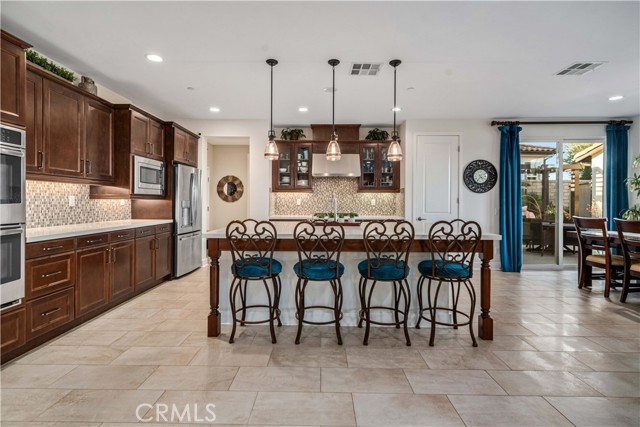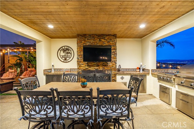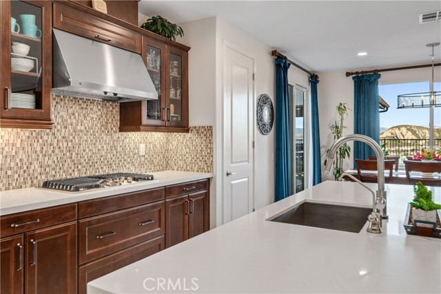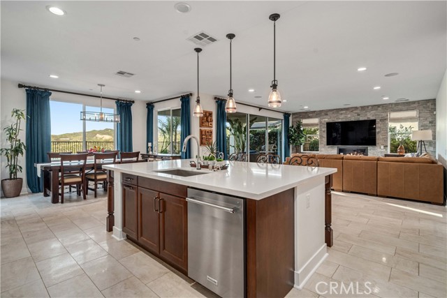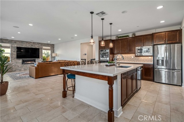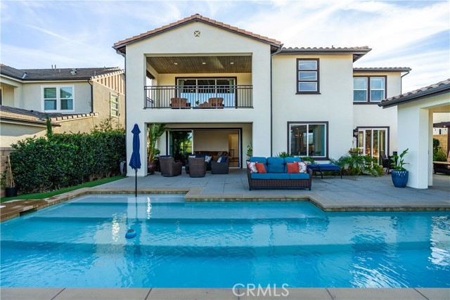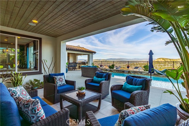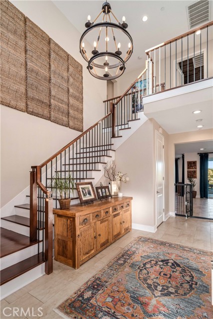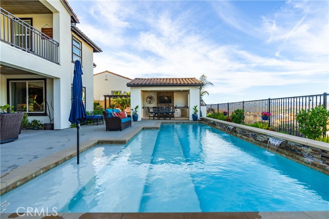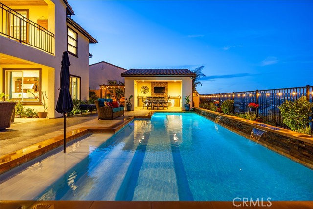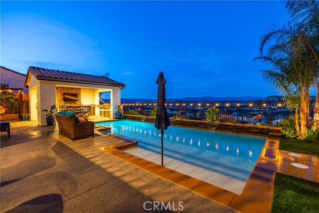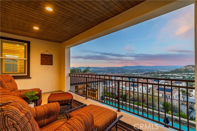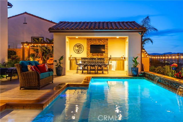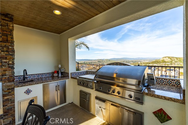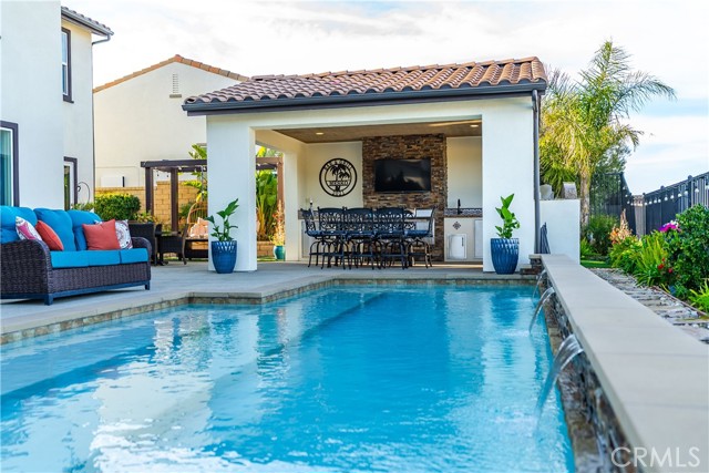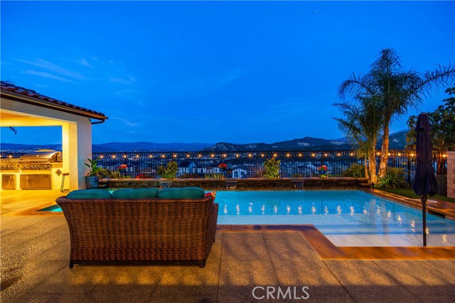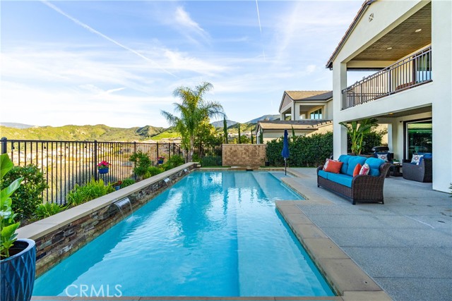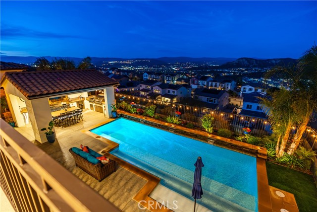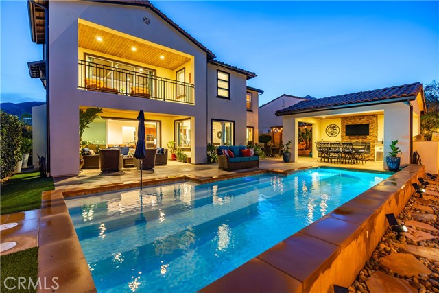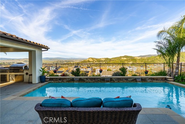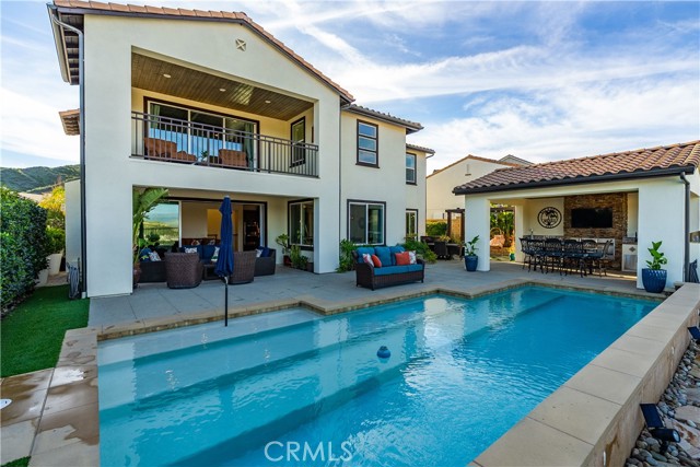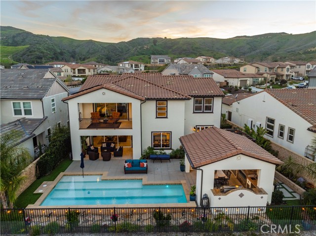 Welcome to elevated luxury living in the prestigious gated community of Aliento. This former model home showcases designer-selected finishes, custom landscaping, and premium upgrades throughout — offering a rare opportunity to own one of the community’s most thoughtfully appointed residences. This stunning 4-bedroom, 3.5-bath view home features panoramic city and mountain vistas, a sparkling in-ground pool, a fully owned 28-panel solar system, and an extraordinary covered outdoor kitchen pavilion — creating the ultimate California indoor-outdoor lifestyle from sunrise to evening lights. Inside, a bright open floor plan is designed for both entertaining and comfortable daily living. Walls of windows and stacked sliding glass doors flood the home with natural light while blending indoor and outdoor spaces. A main-level bedroom with full bath offers flexibility for guests or multi-generational living. At the heart of the home, the gourmet kitchen features abundant prep space, GE Profile appliances, modern finishes, and flows beautifully into the great room, highlighted by a fireplace set within a stacked-stone feature wall — perfect for gatherings or relaxing evenings. A private office overlooking the backyard provides a peaceful place to work or study. Upstairs, a spacious loft offers versatility for a media lounge, playroom, or additional living space. The primary suite is a true retreat, featuring breathtaking views from its private covered balcony. The spa-inspired bath includes a walk-in shower, soaking tub, and custom California Closet system. Two additional secondary bedrooms, a well-appointed bath, and a laundry room with sink complete the upper level. Step outside to your private resort-style yard, where custom front and rear landscaping frame the home beautifully. A covered pavilion anchors one of the most impressive outdoor kitchens you’ll find — featuring a 48-inch grill, double burners, teppan cooking station, TV, and extensive storage — all set beside your in-ground pool with sweeping scenic views. Ideally located near shopping, dining, and conveniences including Trader Joe’s, Starbucks, Target, Lowe’s, and more — plus access to Aliento’s Terrace Club amenities with pool, gym, trails, and community spaces — this home delivers the perfect blend of lifestyle, luxury, and location. A rare opportunity to own a former model view home in one of Santa Clarita’s most sought-after gated communities.
