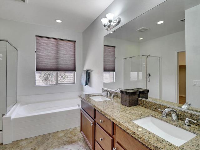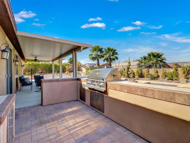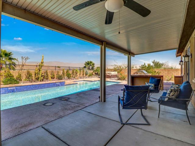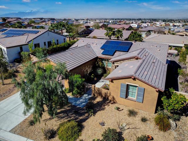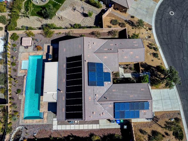 The ideally elevated location of this stunning home in the desirable gated community of the Gallery has breathtaking panoramic sweeping views of the mountains. The VISUAL APPEAL is definitely evident. Now let's check off your next home's FUNCTIONALITY...>Impeccably maintained and smartly configured floorplan of 2361 sqft, 3 spacious bedrooms with woodlike floors, each with their own bathroom. > The Great Room with ceramic tile floors and fireplace opens to the Kitchen and Dining Room becoming the true heart of the home enhancing entertainment. The windows allow natural light and view of the backyard.. AMENITIES INCLUDE..> 24 fully owned Solar Panels, greatly reducing energy costs. > Solar Pool Heating Panels also save pool heating costs. > Under kitchen sink water filter plus whole house water filtration system. >Modern technology includes a smart Ring entry system with app integration and an electric vehicle charging station. BACKYARD FEATURES...> 50 ft. pool with dual waterfall feature, and shallow lounging area. > Cascading Grotto waterfall set in desert landscaping,> Solid Patio Cover. > Above Ground Spa. > BBQ Entertainment Center. Furniture in the home is included. A MUST SEE home to fully appreciate.