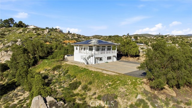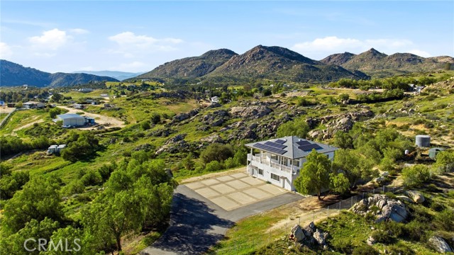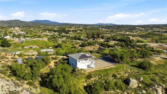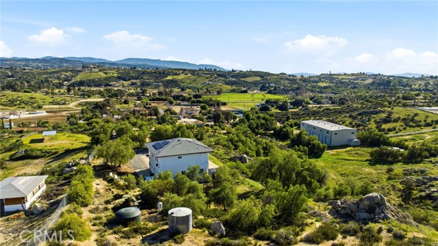 Opportunity knocks with this hidden gem located in the picturesque Temecula Wine Country, conveniently nestled between E. Benton Rd. and De Portola Road. This distinctive estate with freshly painted exterior features a single-family home with an attached ADU, thoughtfully designed as two separate units. The downstairs unit offers 1,600 sq. ft. of comfort, including three bedrooms, one and a half baths, a full kitchen, and spacious living and dining areas. A dedicated laundry room and access to a fenced backyard make this unit both functional and inviting, enhanced by modern upgrades like white cabinetry, stainless steel appliances, granite countertops, and stylish tile flooring throughout. Upstairs, you’ll find a bright and airy unit that boasts high ceilings and two bedrooms, one bathroom, kitchen, living and dining spaces and outdoor laundry room. Step outside to enjoy the large wraparound terrace, which offers breathtaking panoramic views of the surrounding wine country. The property is equipped with a paid solar system and a newer electrical panel, while the beautifully landscaped driveway lined with mature trees provides ample parking. Set on 8.34 acres of rolling hills, this estate also includes a substantial RV garage featuring four bays: one at 3,000 sq. ft. and three at 1,500 sq. ft. each, totaling an impressive 7,500 sq. ft. with soaring 40-foot ceilings. Recently appraised at $1.225 million in July 2025, the property comes with termite clearance, cleared septic and well certifications, along with a newly replaced well pump. Whether you envision an investment opportunity with multiple rental streams or a serene residence where you can live in one unit while renting out the other and the RV garage, this property offers tremendous potential. Some photos have been virtually staged to highlight the possibilities that await.