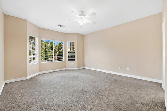 This beautifully refreshed Newport Model in Sun City Palm Desert offers an inviting atmosphere with a soft, neutral interior palette and durable wood-style laminate flooring throughout the main living areas, with carpeting reserved for the bedrooms.The remodeled kitchen showcases crisp white cabinetry, solid surface countertops, and a full suite of stainless steel appliances, creating a bright and functional cooking space. The generously sized primary suite features a charming bay window alcove--perfect for a reading nook, small office setup, or sitting area. The en suite bath includes dual sinks, a walk-in shower, a white vanity, and a spacious walk-in closet. A well-positioned guest bath conveniently doubles as a powder room for visitors.Additional highlights include custom window coverings, ceiling fans throughout, and the builder-option extended garage offering extra space for a golf cart, workshop area, or added storage. A brand-new tankless water heater has also been recently installed.Ideally located within a section of the community that enjoys its own private neighborhood pool, this home offers both comfort and convenience. HOA dues include internet service, cable TV, and access to the nearby community pool. The property is just moments from the residents-only south gate for quick entry and exit, and close to the convenient golf cart and pedestrian access gate leading to Stater Bros., dining, banking, and additional shopping options.