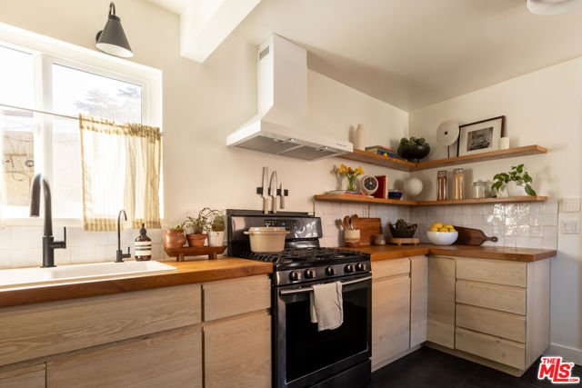 Set behind private gates at the foothills of El Sereno, this designer California bungalow has been thoughtfully reimagined to balance original charm with modern comfort, with interiors that feel truly magazine worthy. An open front porch welcomes you in, an ideal spot for morning coffee while taking in peaceful neighborhood views. Inside, light filled living and dining spaces flow effortlessly together, highlighted by beautifully refinished original oak floors. The fully updated eat in kitchen features French white oak cabinetry with a seamless connection to the expansive backyard. Outdoors, a private retreat unfolds with a large grassy area, covered patio, mature fruit trees, and dedicated garden boxes, creating an ideal setting for both entertaining and everyday enjoyment. The three bedroom, one bath layout is efficient and comfortable, complemented by major system upgrades including a new roof, new windows, and a new HVAC system. An oversized detached two car garage, along with an additional two car parking pad, offers exceptional flexibility; with approved plans already in place to convert the garage into a two story ADU and add an additional bathroom to the main house. Walking distance to hiking trails and South Pasadena, and just minutes from DTLA, Highland Park, and Alhambra, this home presents a rare opportunity as a stylish starter home or investment property in one of Northeast LA's most connected and rapidly evolving neighborhoods