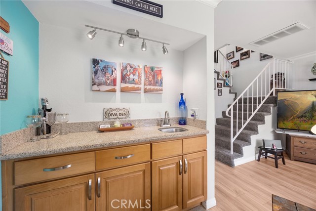 I am excited to introduce you to this delightful 2-bedroom, 1.5-bathroom residence in a quiet, tree-lined neighborhood in the heart of Orange. This home offers 1,190 square feet of comfortable living space with a functional and well-designed layout in a desirable community. Step inside to find beautiful laminate wood and tile flooring throughout and a spacious living area featuring a cozy fireplace, perfect for relaxing evenings at home. The adjacent bar area adds charm and versatility, ideal for entertaining guests or creating your own stylish beverage station. The kitchen and dining area flow seamlessly to a cute private patio, offering the perfect spot for morning coffee, outdoor dining, or unwinding after a long day. Upstairs, you'll find two carpeted and generously sized bedrooms along with a full bathroom, providing privacy and separation from the main living areas. The convenient downstairs bathroom also includes the laundry area with hookups, adding everyday practicality and efficiency. Additional highlights include a one-car garage and a covered carport space, offering ample parking and extra storage options. Centrally located with close proximity to shopping, dining, and freeway access, this home blends comfort, convenience, and charm. Don't miss the opportunity to make this wonderful property your own!