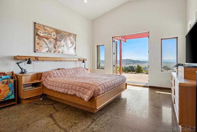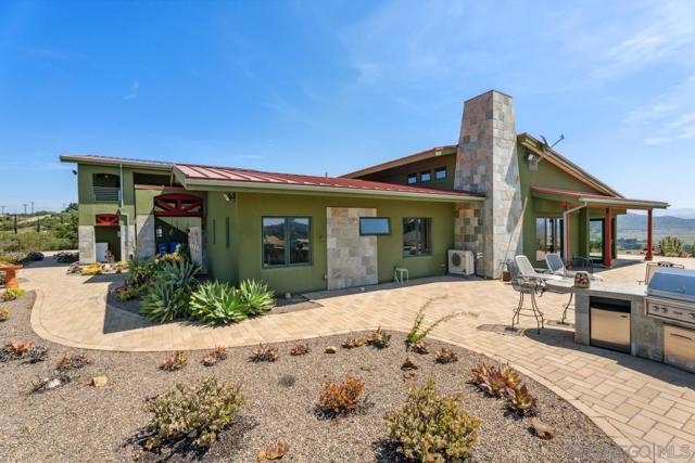 West End of Ramona, this is a Hubbell and Hubbell ICF design made for comfort, sustainability, energy efficiency and fire resistance. Seller owned solar electric & solar water systems. Breathtaking panoramic views abound.Has 8.47 acres with 1575 SF workshop and 609 SF Casita above the spacious 4 car garage. Fronts the 3500 acre Ramona Grasslands. Located on a private road with vineyards and avocado orchards. Multiple ingress and egress options for quick/easy access to amenities and main roads.Ramona airport is in viewing distance. Horses & vineyards permitted.See Documents and Virtual Tour for more information. The main house is 2895 SF with a 609 SF Casita built above the 4 car garage & 1575 SF steel workshop that is an aircraft hangar. House is constructed with Insulated Concrete Form Technology for sustainability and energy efficiency. Natural lighting,energy efficient appliances & plumbing fixtures,owner owned solar water heating and solar electric production plus 2 Tesla batteries add to energy savings.Low water landscaping close to the house.Built to highest US Green Building LEED standards but not certified. City water. House is dual plumbed for waste water release into the septic system and gray water usage in the yard. 2 new complete mini split systems added last year The best part of the property are the VIEWS! Mt Woodson, Julian, Mt Palomar Observatory, Ramona Airport, Ramona Grasslands and abundant native wildlife all seen from inside the house plus the pool and barbecue areas. Steel and fiberglass water tanks DO NOT Convey.