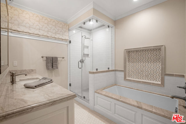 Privately set within the coveted Royal Woods enclave of Sherman Oaks, this mid-century Traditional estate offers a rare blend of architectural character, refined design, and resort-style living. Mature citrus and avocado trees frame the property, creating a lush, serene setting that feels worlds away yet remains moments from the city. The interiors unfold with a graceful sense of flow, where open, light-filled living spaces transition seamlessly for both everyday comfort and elevated entertaining. The grand living room is anchored by a fireplace and enhanced by wood floors, crown molding, soaring ceilings, and expansive wraparound windows capturing sweeping mountain views. At the heart of the home, the chef's kitchen makes a bold statement with custom cabinetry, premium appliances, high-end granite surfaces, and a custom stainless steel hood and bar highlighted by a striking geostone countertop showcasing 50-million-year-old fossilized fish, a true conversation piece. Two luxurious primary suites offer flexibility and privacy, including a secluded second-level retreat with a spa-inspired bath featuring a Victoria + Albert soaking tub, steam shower, granite countertops, Columbia cabinetry, framed mirrors, and a dedicated makeup vanity. A custom second-floor landing with built-in cabinetry and desk creates an ideal home office or study. The main-level primary suite features an elegant en suite bath with separate tub and shower, granite counters, and custom window treatments. Completing the first floor are three additional bedrooms, three bathrooms, a powder room, a warm den with fireplace, wine bar, and a dedicated laundry room.Designed for the quintessential Southern California lifestyle, the home opens to an exceptional outdoor entertaining environment. The resort-style backyard features a fully appointed outdoor kitchen with a 48" DCS barbecue, prep and sink stations, refrigerator, dishwasher, stainless steel cabinetry, big-screen TV, and pergola with integrated heater. A half basketball court, pool and spa, fire pit, and thoughtfully layered landscaping accented by Bouquet Canyon stone and lush greenery create a private, tranquil retreat. Offering the perfect balance of retreat and connection, this Royal Woods residence delivers a lifestyle defined by comfort, sophistication, and ease. Tucked within one of Sherman Oaks' most desirable neighborhoods, the home is moments from highly regarded schools and Ventura Boulevard's vibrant dining and shopping scene, with easy access to the Westside presenting a rare opportunity to enjoy peaceful living without sacrificing proximity to the best of Los Angeles.