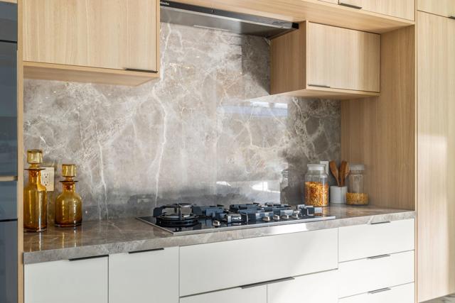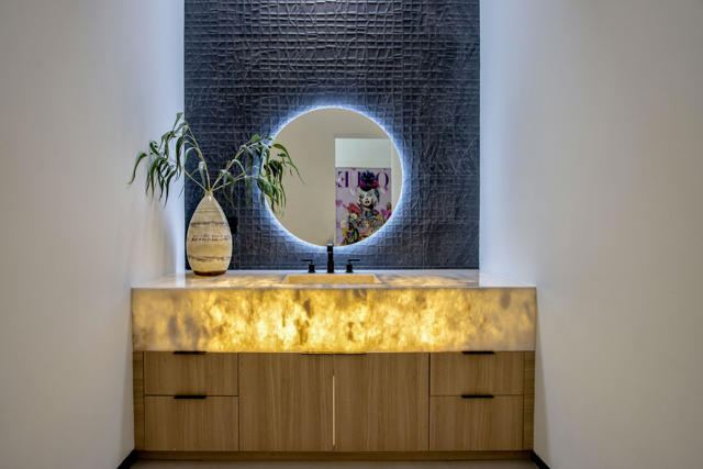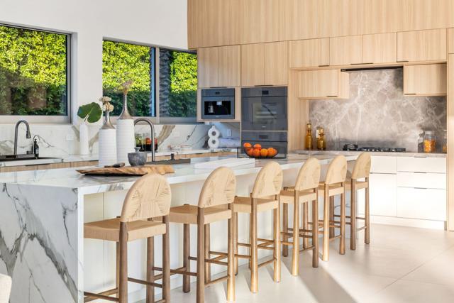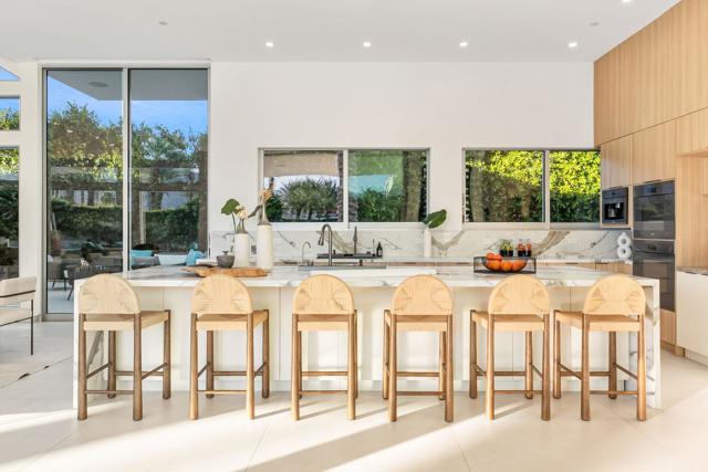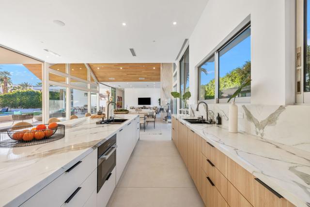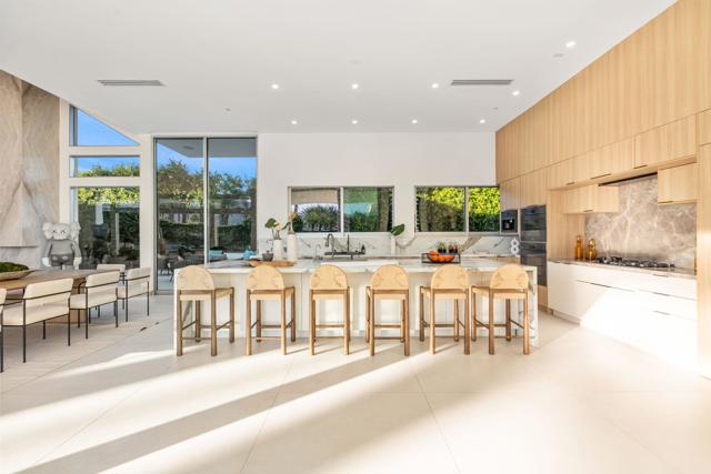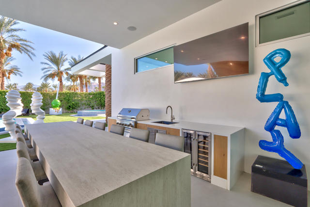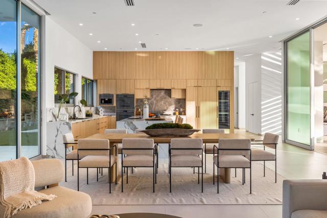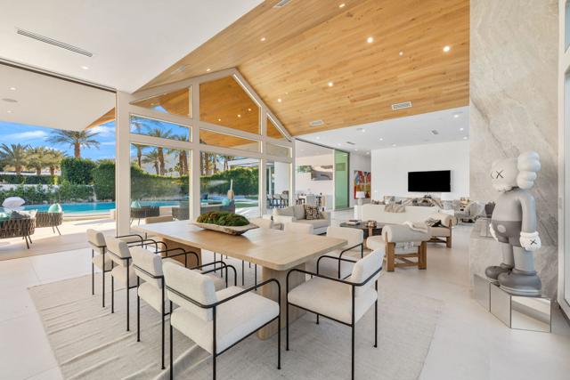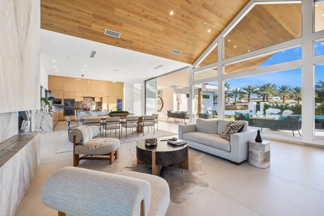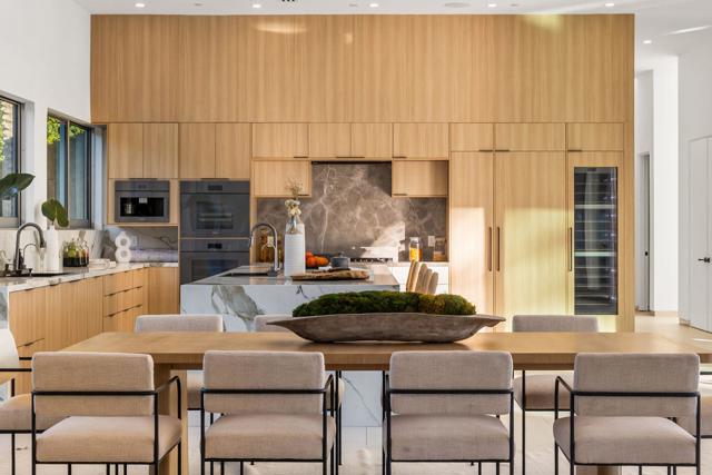Experience the pinnacle of luxury living in the heart of Rancho Mirage at Makena, an exclusive retreat designed for those who value design, privacy, and effortless indoor outdoor living. This striking new estate, inspired by legendary architect Joseph Eichler, offers a rare balance of architectural presence and modern livability, ideal for a discerning buyer seeking both style and substance.An 18 foot ceiling anchors the open concept living space, where mountain views are framed through walls of glass and a dramatic book matched porcelain fireplace creates a natural focal point. The wood paneled A frame roofline introduces warmth and scale, bringing a sense of intention to every line and material.The chef's kitchen is both refined and functional, featuring full white oak cabinetry, a 20 foot island, and integrated Miele appliances, designed for seamless entertaining and everyday use. Smart home integration allows effortless control of lighting, audio, and climate, enhancing the experience without overwhelming it.The primary suite is a private retreat, opening directly to the pool and spa. The spa inspired bath features a double walk in shower and freestanding tub, creating a calm, restorative environment.Set on over half an acre, the outdoor living experience is equally considered. An octagonal infinity edge pool, spa, expansive outdoor kitchen with a 20 foot island, and multiple fire features create a setting designed for both intimate evenings and larger gatherings.This is more than a home, it is a statement of clarity, taste, and quiet confidence.