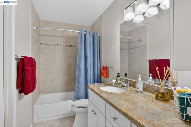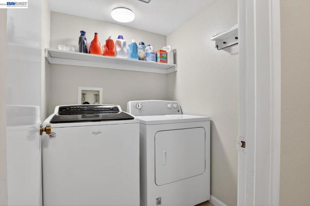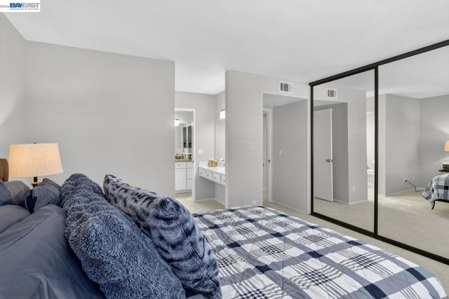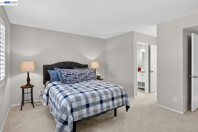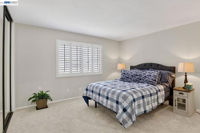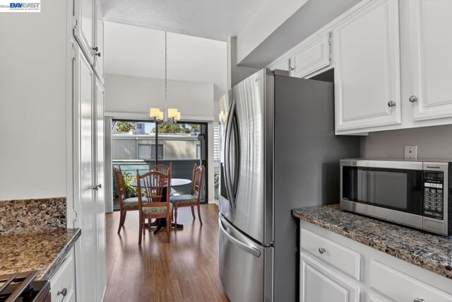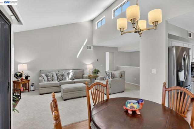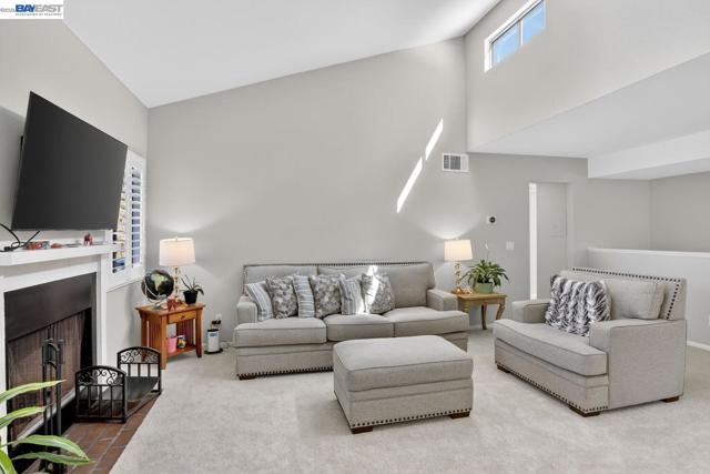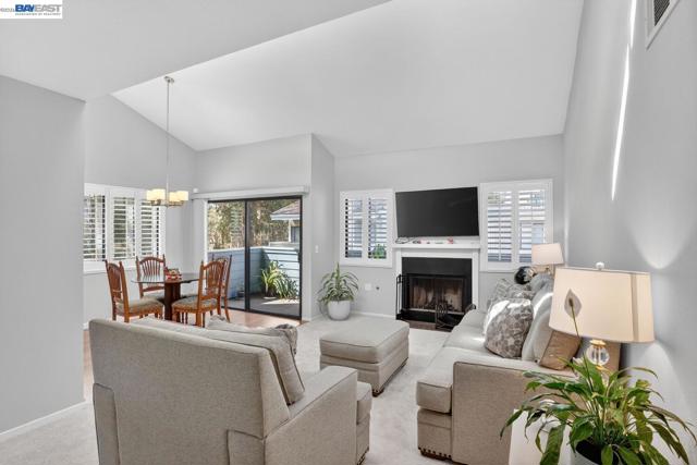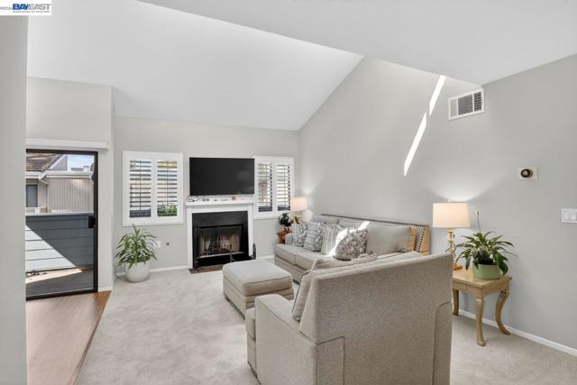 Come see this move-in ready condo with a bright open floor plan, vaulted ceilings and abundant natural light. The main living area is inviting with a cozy, gas fireplace, fresh interior paint, and newly installed carpeting. The updated kitchen boasts stainless steel appliances, white shaker cabinetry, granite counters and matching granite backsplash perfect for everyday cooking or entertaining. The primary suite includes a half bath, ample closet space, and mirrored closet doors while the second bedroom is open and naturally bright. New carpeting has been installed in both bedrooms. The renovated full bath features granite counters, designer vanity, and a tiled tub/shower surrounding. Stylish, designer plantation shutters and shades are found throughout the home. Central heating and cooling systems are controlled by a nest thermostat. The corner location adds privacy, while the in-unit laundry and 2-car garage provide convenience and storage. Centrally located, this unit is steps away from peaceful trails and community pools/spa/tennis courts. The popular San Francisco Bay trail, local shopping plazas and major roads/I-80/highway 4 are just a minutes' drive. Come see for yourself at our open house this Easter weekend from 2-4pm both Saturday and Sunday.