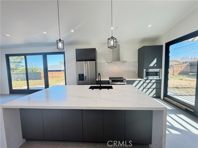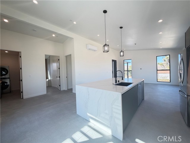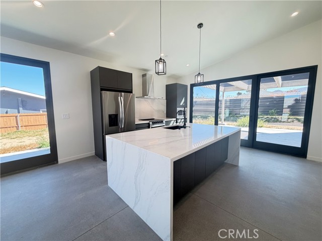Experience modern desert luxury in this stunning never lived in 2024 new-construction masterpiece located in the heart of Joshua Tree. Perfectly blending contemporary aesthetics with high-efficiency living, this 2-bedroom, 2-bathroom home offers 1,302 sq. ft. of meticulously designed space. Step inside to an expansive open-concept floor plan featuring soaring ceilings, polished concrete floors, and abundant natural light. The chef-inspired kitchen serves as the home's centerpiece, boasting a double-waterfall quartz island, custom cabinetry, and premium stainless steel appliances. Both bedrooms are generously sized, while the bathrooms offer a spa-like retreat with custom tile work and sleek walk-in showers. Designed for the modern environmentalist, the property includes fully paid solar panels and an energy-efficient zoned ductless mini-split HVAC system. Outside, the property sits on a spacious lot with mountain views, offering a blank canvas for your desert oasis or a high-end short-term rental. Located just minutes from the Joshua Tree National Park entrance and the vibrant local Village, this home is the ultimate desert sanctuary.