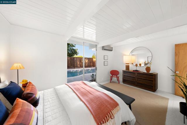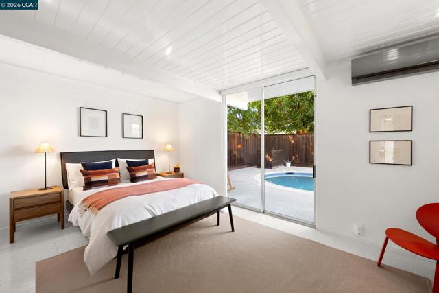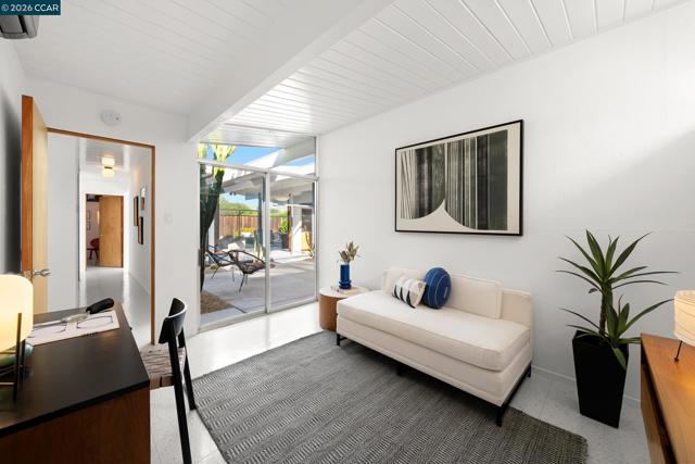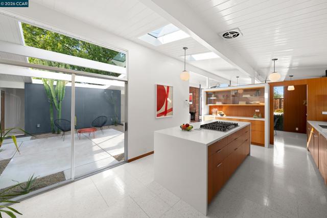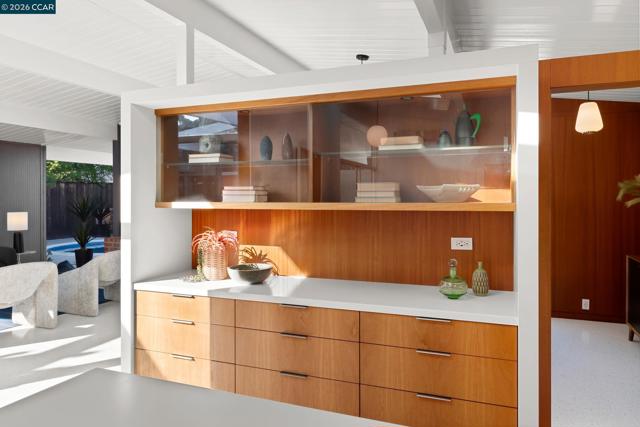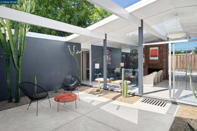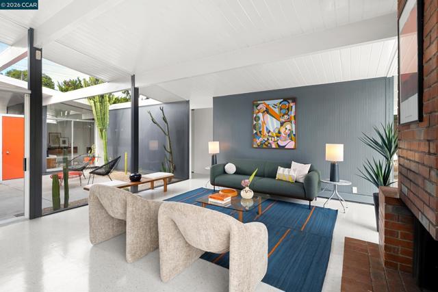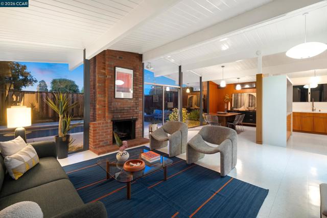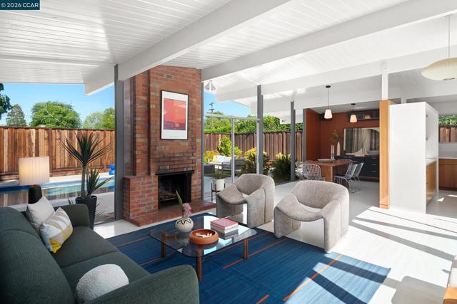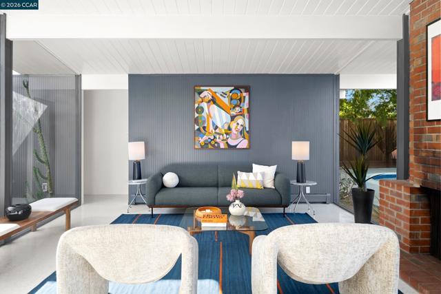 The epitome of California cool, this exceptional Eichler offers iconic mid-century modern living for the most discerning tastemakers. Built by renowned developer Joseph Eichler and designed by architects Jones & Emmons, this coveted pitched-roof, atrium, carport model, Plan OJ-1184, is an architectural offering that seamlessly blends timeless design with modern comfort. As featured in Atomic Ranch and the San Francisco Chronicle — and soon to be featured in an upcoming Eichler book, the home reflects a deep respect for its original design, enhanced by thoughtful, period-appropriate updates. Rich mahogany cabinetry by Berkeley Mills anchors the space, complemented by elegant wood paneling and classic VCT tile flooring that runs throughout, preserving its authentic mid-century character. Walls of glass flood the interiors with natural light, creating a bright and airy ambiance while fostering a seamless connection between indoor and outdoor living spaces. The signature atrium serves as a tranquil centerpiece, perfect for relaxation or entertaining. Designed for both everyday comfort and effortless hosting, the home features a chef’s kitchen with a generous island, ample pantry space, a new gas cooktop and stainless steel appliances. Additional highlights include a recently resurfaced pool, home sound system and a converted studio garage—ideal for a home office, gym, or creative retreat. Sustainability meets style with owned solar panels, allowing for energy efficiency and savings without compromising on luxury. Located in the vibrant Rancho Del Diablo community, the home enjoys picturesque surroundings with views of Mount Diablo and convenient access to BART, shopping, dining, and major freeways. Timeless design, elevated living, and unmistakable mid-century style—this is Eichler at its best.