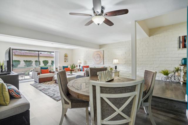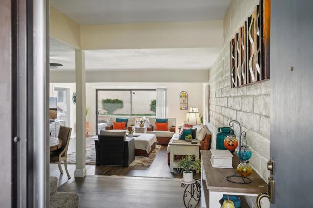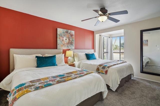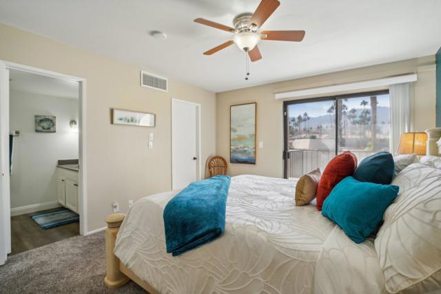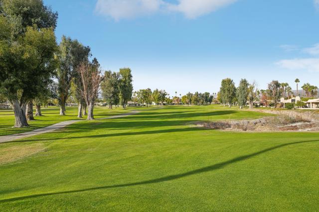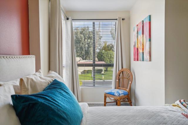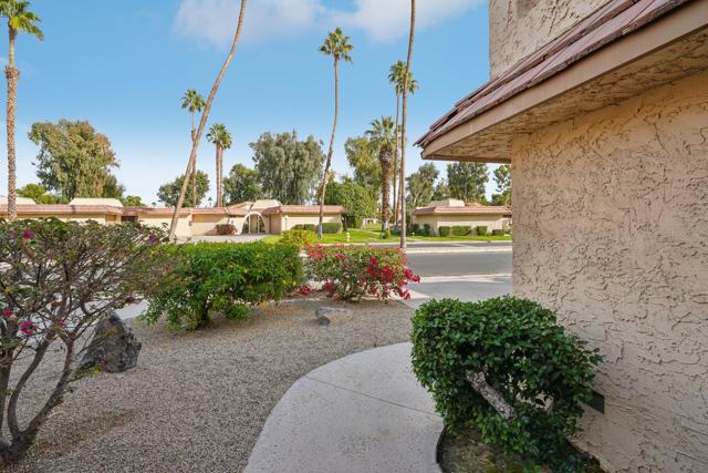 Welcome to your desert retreat in the gated Cathedral Canyon Country Club, where stunning mountain views, dramatic desert skies, and a peaceful, quiet setting offer a true escape from the hustle of city living. This spacious, light-filled home features an open floor plan designed for comfort and easy entertaining, enhanced by a large sliding glass door in the living room that floods the space with natural light and creates seamless indoor-outdoor living.The kitchen offers ample counter space and a convenient laundry closet with a full-size washer and dryer. The living room includes a built-in bar and clever under-the-stairs storage, providing functionality without sacrificing space. A half bath on the main level adds everyday convenience and makes entertaining guests effortless.Upstairs, two expansive primary suites provide privacy and flexibility, each with a walk-in closet and private en-suite bath--offering the best of both worlds. The west-facing primary suite features a standing shower, beautiful mountain views, and a private balcony perfect for enjoying breathtaking desert sunsets. The east-facing primary suite offers partial golf course views, a tub/shower combination, and a dedicated space ideal for a desk or cozy reading nook, allowing you to enjoy morning light. Step outside to your private patio framed by breathtaking mountain scenery, just steps from the community pool. Retractable awnings provide shade for year-round enjoyment. Additional highlights include a covered garage and beautifully maintained grounds.This condo has been gently used and meticulously maintained, with the upstairs carpet like new. For added peace of mind, the air conditioning was serviced last summer, ensuring comfort year-round. Cathedral Canyon Country Club offers amenities including a championship golf course and heated pools, all within a tranquil, well-kept community that feels tucked away--yet remains centrally located near shopping, dining, and entertainment. Homes offering this combination of views, outdoor spaces, functionality, and quiet resort-style living are rarely available--don't miss this opportunity.