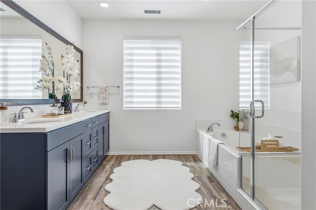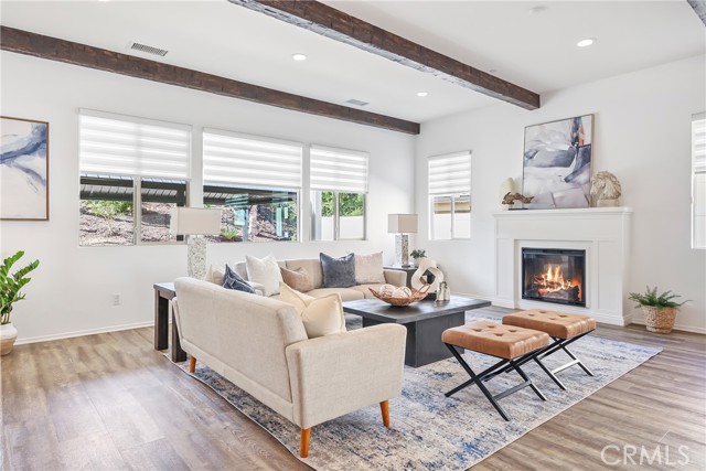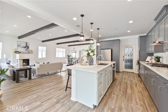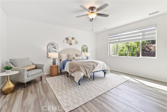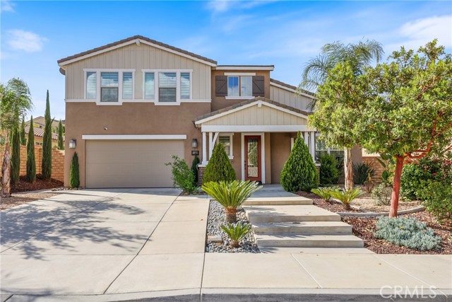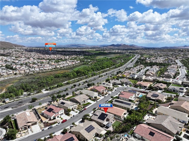 UPGRADES GALORE! FULLY SOLAR-POWERED, POOL-SIZED LOT IN GATED AUDIE MURPHY RANCH COMMUNITY! Welcome home to this meticulously upgraded 6-bedroom, 3-bathroom, 3,500 sq ft masterpiece on a massive 12,000 sq ft lot in the prestigious gated Audie Murphy Ranch community in Menifee. Fresh paint throughout, a brand-new partial roof, professional landscaping, and so much more. Step inside the grand entrance with soaring ceilings. The heart of the home is the expansive great room with a stunning shiplap accent wall, massive wood beams, a custom chandelier, wall-to-wall windows flooding the space with natural light, and a cozy electric fireplace with a custom wood mantel. Open to this area is the gourmet kitchen of your dreams: high-end gas cooktop, stainless-steel appliances, gorgeous backsplash, quartz counters, soft-close gun metal grey cabinets, and a walk-in pantry that’s an entertainer’s fantasy—complete with shiplap shelving, quartz counters, open-faced storage, and a dedicated coffee bar. Brand-new custom pantry door and custom blinds add the perfect finishing touches. There is a large laundry/mudroom (with cabinets, wash sink, and tons of storage), and a 3-car garage featuring epoxy floors and a huge overhead storage system. Upstairs you’ll discover three bedrooms plus a spacious loft with built-in bookshelves. The upgraded bath offers dual quartz vanities and a shower/tub combo. The oversized master suite is pure luxury: abundant windows, a spa-like bath with dual vanities, separate shower, and a huge walk-in closet complete with custom white built-ins and a crystal chandelier. The massive backyard boasts custom pavers, a large aluminum-covered patio, lush artificial turf, a dog run, and pre-piping for a gas fire pit or BBQ—perfectly sized for a giant pool. A brand-new Rachio smart watering system with app control and whole-house water purification + softener system means effortless maintenance and pristine water quality inside and out. Plus, a full alarm system with cameras gives you total peace of mind. This gated community delivers resort-style living with three pools, a spa, sports courts, skate park, hiking/biking trails, clubhouse, and parks. Award-winning Menifee USD schools (including Taawila Elementary) are right around the corner, with easy access to shopping and the 15/215 freeway. This is the one you’ve been waiting for. Don’t miss your chance to call this upgraded beauty home—schedule your private showing today!