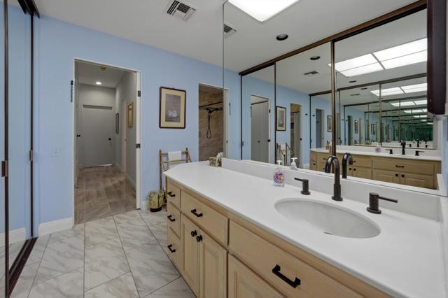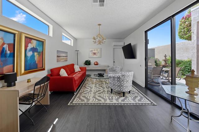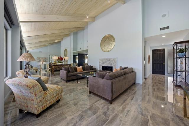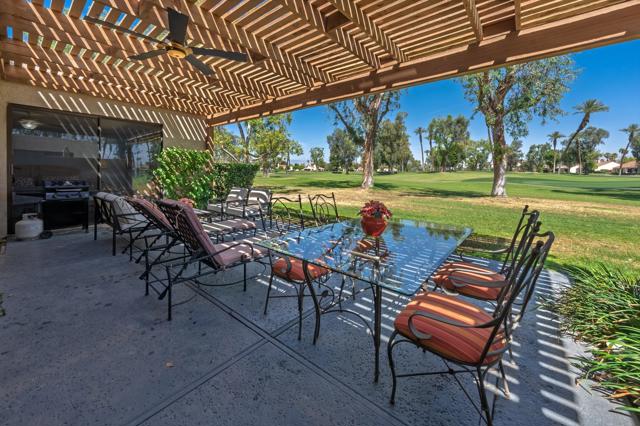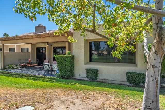 This beautifully maintained condo home located within the highly sought-after guard-gated Mission Hills Country Club, offering exceptional amenities including three private golf courses, 27 tennis courts, pools, spas, a premier fitness center, and optional golf, tennis, and social memberships. Enter the lovely private courtyard with tranquil fountain and room to relax. The main no-step living area is both dramatic and inviting, highlighted by a vaulted wood-beam ceiling, ceramic tiled flooring, bar with beverage refrigerator, gas fireplace, and open sightlines that frame the panoramic golf course views. The main bedroom suite is a serene retreat with breathtaking picture window with serene views and direct access to the terrace. The updated bath has double vanities, and good closet space Generous guest bedrooms one of which is used as convertible den with walk-in closet and access to patio.Offered furnished per inventory, making it ready for immediate enjoyment. Also, included is leased solar system of $90.84 month so rarely get an electric bill.The attached two-car garage plus a dedicated golf cart garage offers convenience and is lined with huge closets, loads of storage. Additionally, a generous parking area is nearby for guests. The land lease has been extended to 2121, providing long-term peace of mind. HOA includes 3-guard gated security entrances, Internet, Cable TV, roof maintenance, exterior painting of structure and patio walls, landscaping, common area maintenance, lake maintenance, trash, and choice of several community pools and spas nearby! A rare offering for full-time living or an unforgettable seasonal retreat or seasonal rental income opportunity.