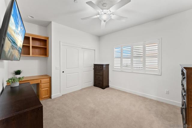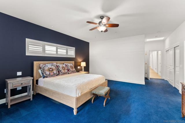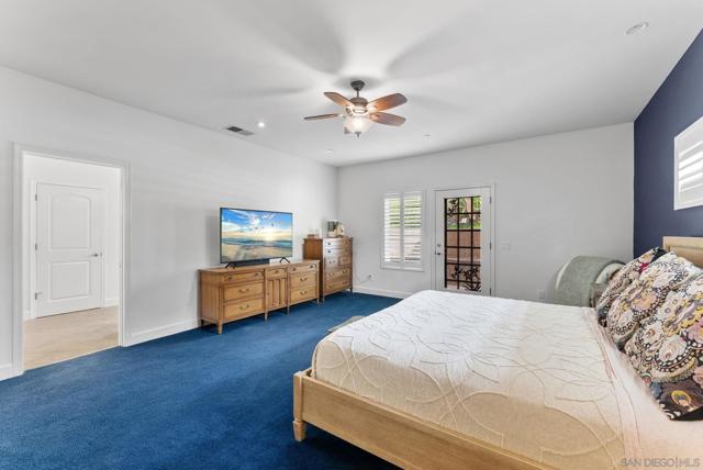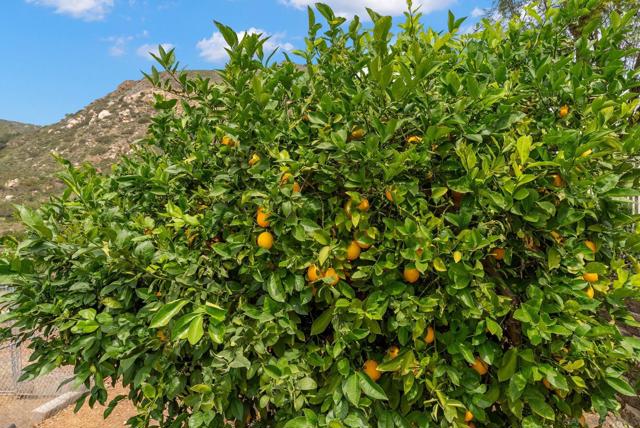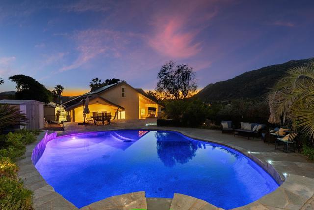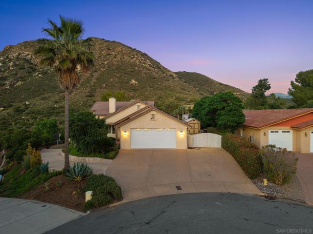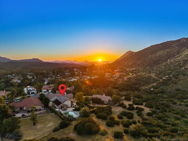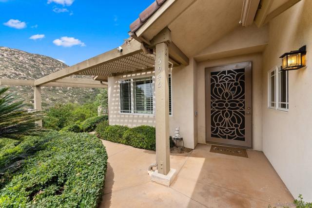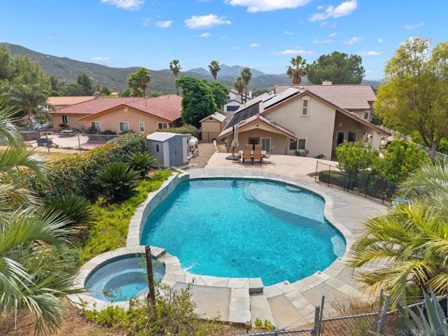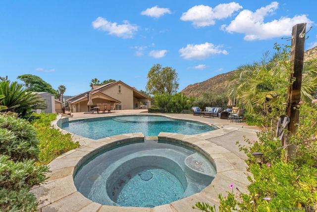 Resort style, single story, custom built home at the end of a private cul-de-sac with mountain views, owned solar with back up batteries in a well established community! 4-bedroom, 3 full bath home plus an office/library off the formal entry hall. Dramatic wood cross-beam ceilings, soaring picture windows with expansive views and a raised-hearth stone fireplace with blower, built-in shelving, and seamless flow to the kitchen and dining areas. Hardwood and tile flooring throughout. Chef inspired kitchen with granite countertops, wine fridge, Bosch fridge, island with sink and two refrigerated drawers, 6-burner gas range, built-in desk, & walk-in pantry. Formal dining room overlooks the outdoor kitchen, large patio, and mountain views. Spacious primary suite with plush carpeting, private covered patio access, and an en-suite bath featuring dual vanities, soaking tub, large walk-in shower, and ample storage. Two secondary bedrooms include built-in desks and share a Jack-and-Jill bath. Guest bedroom sits near a full hall bath with access to the laundry room with extra cabinetry and counter space. Enjoy the private solar-heated pool and spa, outdoor kitchen with Viking gas grill & cooktop, sink, skylit wood ceiling and multiple view terraces and entertaining patios. Outdoor spaces include a front-facing terrace off the great room, grass area below the pool, and a private pool terrace with storage shed, elevated waterfall spa, and wraparound patios ideal for stargazing. Gated side driveway offers RV parking and RV hookups and storage. Mature landscaping includes apricot, plum, Meyer lemon, Bearss lime, navel orange, bay laurel, key lime, Mexican lime, and chardonnay grapevines. Additional features: whole house filtration system, new AC, ceiling fans, skylights, dual-pane windows, owned solar with 3 back up batteries. Located within San Diego Country Estates, a master-planned community known for its resort-style amenities and scenic backcountry setting. Residents enjoy access to an award-winning golf course, equestrian centers, pools, parks, and miles of hiking, biking, and riding trails, along with a strong sense of community and year-round events.