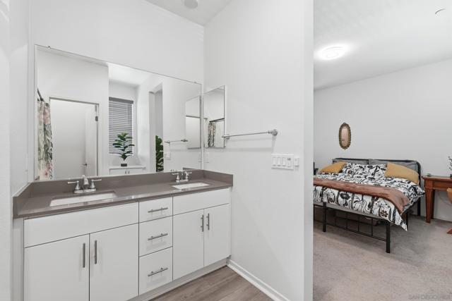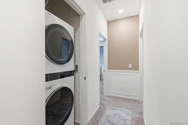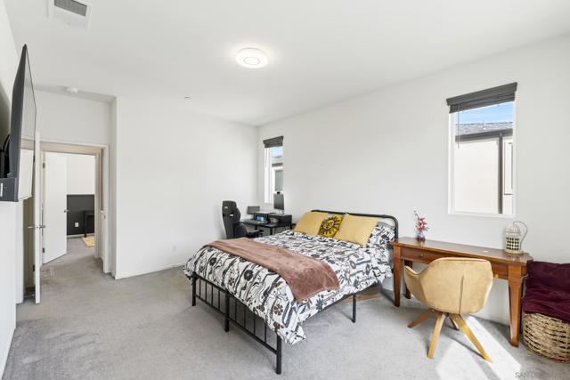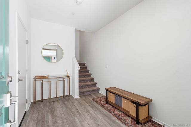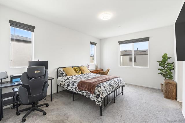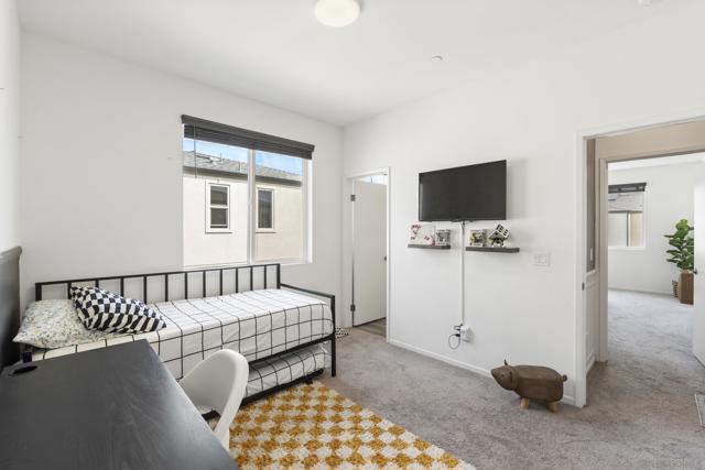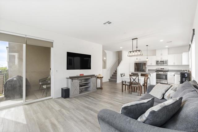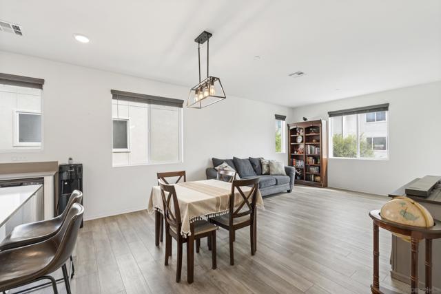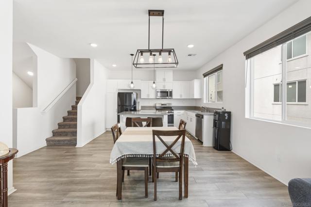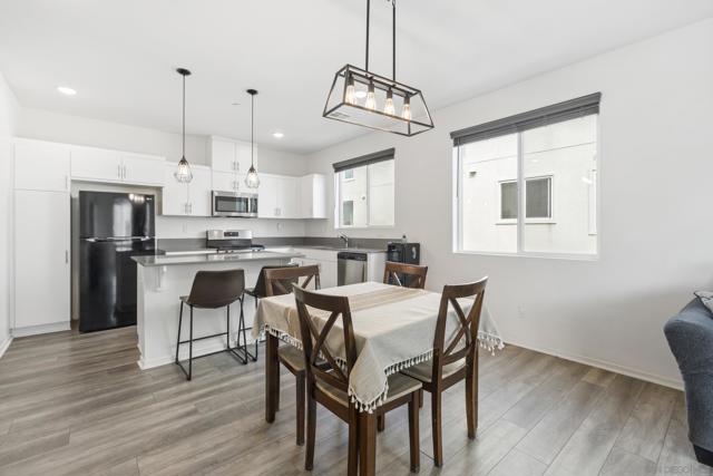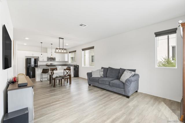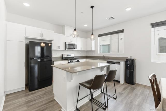Step into this bright, beautifully updated 1,321 sq ft townhome and feel instantly at home. Featuring an open-concept design, high ceilings, and abundant natural light, this modern three-story condo offers the perfect blend of style and everyday comfort. The spacious living room flows seamlessly into the dining area and open kitchen. Built in 2021, the home has a clean, contemporary feel throughout. The kitchen is equipped with stainless-steel appliances—including a gas range and built-in microwave—along with a generous pantry and a large breakfast bar, making meal prep easy and enjoyable. A sliding glass door opens to your private balcony, perfect for relaxing with a view of the community grounds. Upstairs, you’ll find two generously sized bedrooms, each with its own bathroom, plus a full-size stacked washer and dryer for convenience. Additional highlights include an attached two-car garage with built-in storage shelving and epoxy flooring, fresh neutral paint, wood-look flooring throughout, and contemporary lighting. The home is move-in ready with recent updates and low-maintenance living. Located in a highly convenient spot, you’re just minutes from the 905 and 805 freeways, making commuting effortless. Community Amenities: The community features a full-sized pool, grilling area, jacuzzi, and a park for kids and dogs. - Smart Home Features: The home includes apps to control the garage, kitchen lights, and HVAC system. The electric water heater can also be controlled remotely with the press of a button.