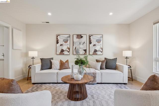 California's indoor-outdoor lifestyle is captured to great effect in this cozy, turnkey LEVEL IN SINGLE LEVEL modern farmhouse. Located in the heart of West Berkeley and positioned near the vibrant Fourth Street district, the 3-bedroom home sits behind a gated front yard while maintaining effortless flow to a private, flat yard for outdoor entertaining. Meticulously maintained and thoughtfully updated, the property has integrated some high-efficiency features such as a modern heat pump AC system, and dual pane windows earning a 9/10 Home Energy Score, BESO Compliance, and a $0 Section 1 clearance. The interior is anchored by the organic texture of European Oak plank floors, while contemporary touches such as new designer lighting throughout and modern black-trimmed dual-pane casement windows flood the spaces with natural light and clear sight lines. The updated chef’s kitchen achieves a balance of old and new, featuring shaker-style cabinetry, quartz countertops, a classic subway tile backsplash, stainless steel GE appliances and an eating area with a built-in corner banquette. The bathroom features a subway tile shower surround with a charcoal hexagon tile floor for a modern pop. Two bedrooms off the living area feature frosted glass barn doors on the closets, while a flexible third bedroom offers a quiet retreat. An indoor laundry room features ample counter space, side-by-side W/D and outdoor access. Thoughtful storage is achieved through adjustable Elfa closet organizer systems throughout. The sunny backyard is a private modern oasis for nature lovers and garden enthusiasts, featuring low maintenance turf, gravel seating area, raised veggie beds, and established trees for extra privacy. With a 93 Walk Score and 94 Bike Score, it offers easy access to Rosa Parks School, local favorites like Franklin Brothers Market and Cafe Chiave, and is a short distance to North Berkeley BART.