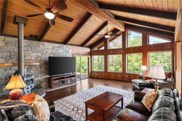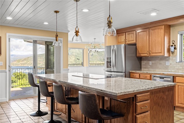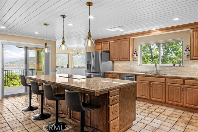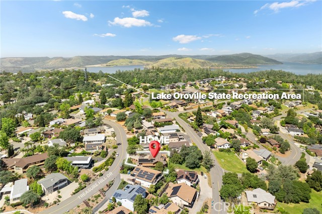 Enjoy stunning lake views in this rare gem—an exceptional ABC Cedar CUSTOM built home offering character and craftsmanship. Showcasing exceptional detail, this property features custom woodwork throughout and a striking stone fireplace that anchors the living space with warmth and charm. Thoughtfully paired with modern comforts, the home offers fully owned solar, newer HVAC, roof, windows, and updated appliances. Over the years, the seller has carefully enhanced the home with updated flooring, fresh paint, and more—always preserving its original charm and timeless appeal. The main level welcomes you with an immediate sense of space and light. As you enter, you're greeted by a spacious living room with breathtaking lake views that continue seamlessly through the kitchen, dining area, and primary suite. The kitchen has been tastefully updated with newer cabinetry, countertops, and upgraded appliances, offering both style and functionality. A custom laundry room adds convenience with a full wall of pantry storage and additional counter space. The primary suite is beautifully updated, featuring a step-in shower, double vanity, and a generous walk-in closet. Downstairs, the home lives like a second residence—complete with additional bedrooms, a full bathroom, living room, second laundry area, and an expansive media room featuring a kitchenette and projection theater with big screen. This setup is ideal for multi-generational living or hosting guests with ease. Step outside to an expansive back deck designed to take full advantage of the stunning lake views and sunshine—perfect for relaxing or entertaining. In addition, the home offers abundant storage throughout, complete with a workshop and a spacious three-car garage—perfect for hobbies, projects, or extra space. This is truly a must-see home that offers space, flexibility, and unmatched character plus upgrades such as a complete whole house vacuum system serving both levels, built in cabinetry/workbench in garage, home generator and so much more. Come experience the beauty, comfort, and lifestyle this home has to offer—just minutes from beautiful Lake Oroville, where endless outdoor adventures and unforgettable moments await.