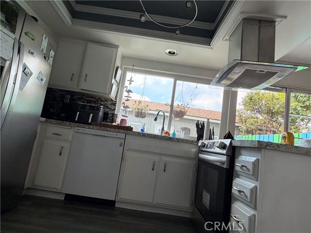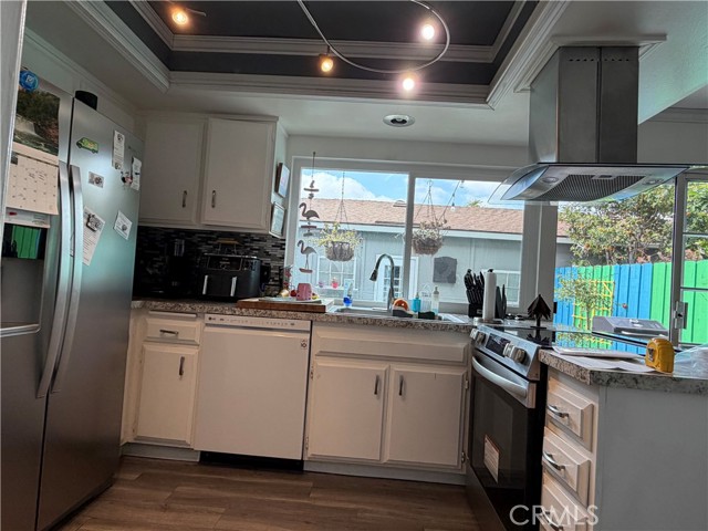 Two story Townhouse in Garden Grove. Close to Disneyland Resort, 4 major freeways (5, 55, 57 and 22), UCI Medical Center and The Outlets of Orange. Completely remodeled kitchen: Features: New counter tops, electric burners and oven, with gorgeous hood and dishwasher and a huge pantry. Brand new flooring throughout the townhome. Downstairs will you find the living room, 1/2 bathroom, dining room and kitchen with the dining room sliding glass door leading out to your oasis patio with direct access to your two car garage with plenty of storage and shelving (Great for BBQing and private diners). Upstairs: Features 3 bedrooms and full bathroom with separate bathtub and shower. Primary bedroom is huge with mirrored wardrobe. ASSOCIATION FEATURES: Swimming Pool, Basketball Court, Kids Playground and equipment and Club House w/Fireplace. And the Association Due's are half that of the County average. Plus the home has been painted inside and out. Also double door entry. And near new washer and dryer included. TURNKEY!