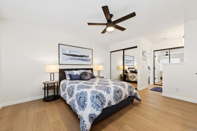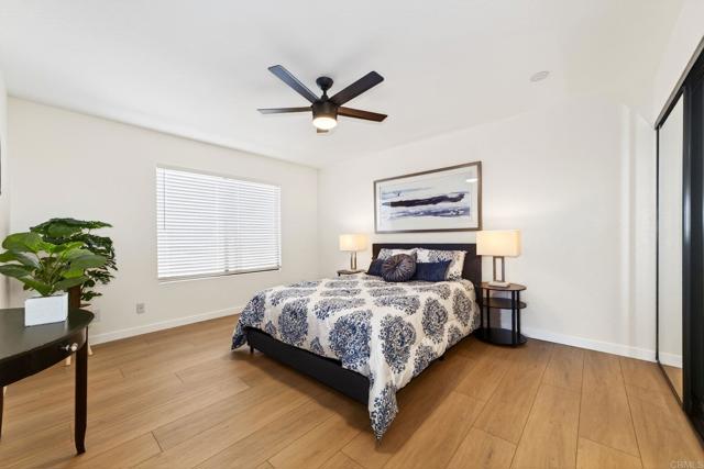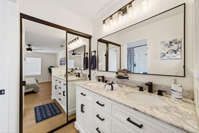 The one you’ve been waiting for! Welcome to this beautifully remodeled 2-bedroom, 2-bath condo in the desirable Avocado Gardens community of San Marcos — where modern design meets comfort, privacy, and mountain views. Step inside and immediately notice the soaring vaulted ceilings in the living and dining areas, creating an open, airy feel rarely found in condos at this price point. Natural light fills the space, drawing you toward the modernized fireplace featuring contemporary “Fire & Ice” crushed glass — a stunning focal point that adds both warmth and style. The fully remodeled kitchen is thoughtfully designed with quartz countertops, white shaker cabinetry with soft-close doors and drawers, and stainless-steel appliances. From the kitchen, dining area, and private balcony, enjoy peaceful mountain views and the added benefit of no rear neighbors. Luxury vinyl plank flooring runs throughout the main living areas, complemented by designer three-tone paint and matte black ceiling fans that carry a timeless black-and-white aesthetic from room to room. The spacious primary suite offers dual closets and a dual-vanity ensuite bathroom, providing both functionality and comfort. The secondary bedroom and bath are equally well-appointed, ideal for guests, a home office, or roommates. Even the attached garage has been upgraded — freshly painted with a sleek epoxy-coated floor for a clean, finished look. The building itself is gated for added privacy, and residents enjoy access to Avocado Gardens amenities including a pool, spa, and playground. Located just minutes from California State University San Marcos, with convenient access to I-15 and Highway 78, this home offers both style and everyday practicality. Turnkey. Elevated. Ready for its next owner.