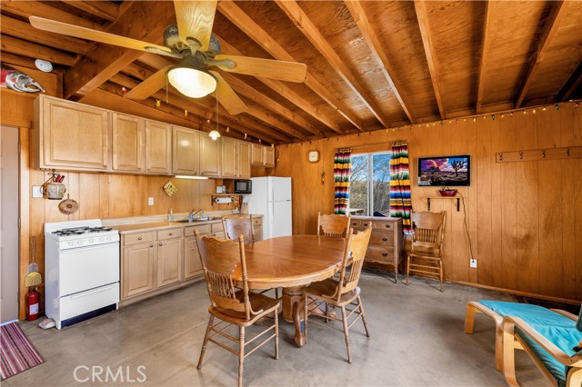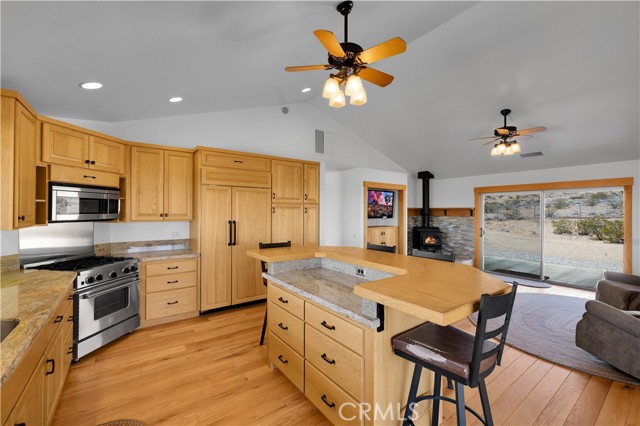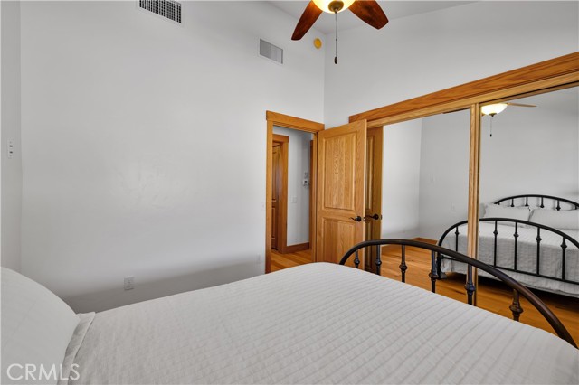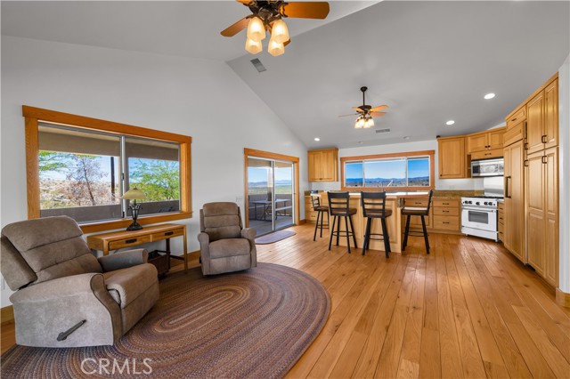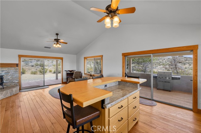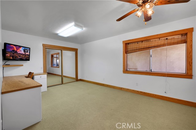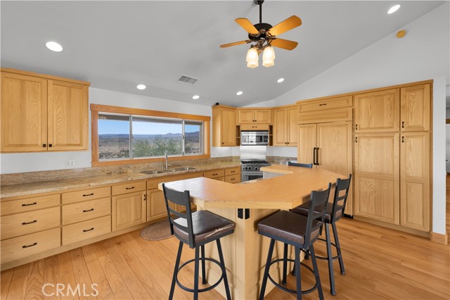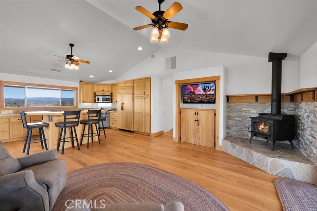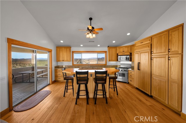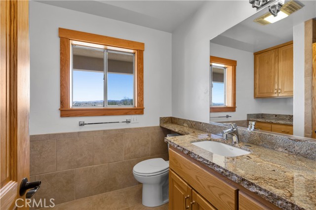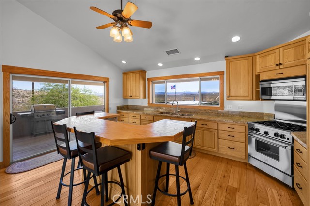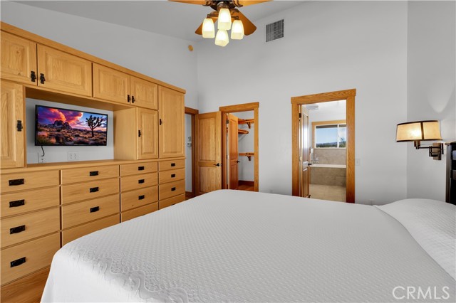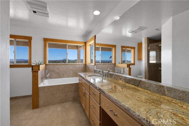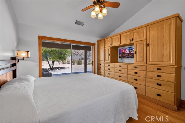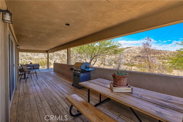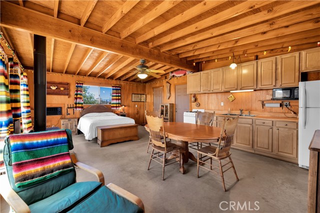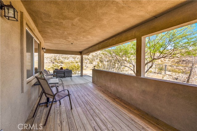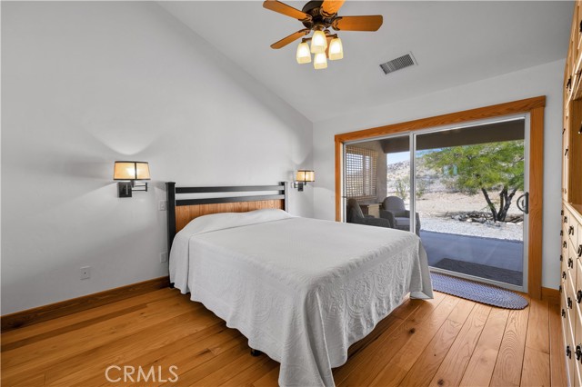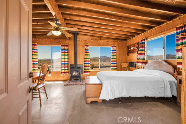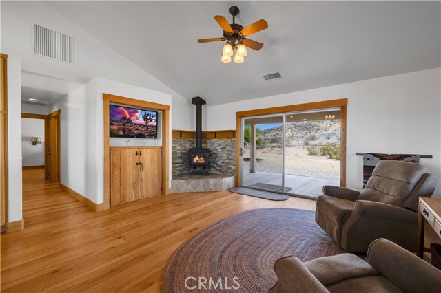 Large two-story main home, additional cabin, and a 2,400 sq ft workshop all on a fenced 5-acre parcel. This unique property is the last home on the street, backed directly against the mountain, offering incredible panoramic views overlooking all of Landers and unmatched privacy. The 2012 custom-built two-story main home features high-end finishes throughout, including real wood flooring, custom oak cabinetry, and laundry rooms on both levels. The upper level showcases vaulted ceilings and an open-concept layout, with a spacious kitchen featuring raw-edge granite countertops, abundant cabinetry, and ample workspace. The living room includes a wood stove and multiple sliders leading to both the front wraparound balcony and back patio. Bedrooms are generously sized, and the primary suite offers a massive walk-in closet, patio access, and a beautifully finished bathroom with soaking tub and walk-in shower. A bedroom on the lower level and a fully finished two-car garage add to the flexibility. The separate cabin provides excellent additional living space for guests, featuring an open layout, well-preserved retro charm, beautiful views, its own bathroom with walk-in shower, front porch, and a cross-fenced yard. The 2,400 sq ft metal workshop is a standout feature, equipped with three RV-height roll-up doors, power throughout with multiple 220 outlets, laundry hookups, a car lift, and custom fabrication tables with built-in storage—ideal for hobbyists, contractors, or business use. Additional features include a Connex storage container and full RV hookups. Properties offering this level of space, privacy, views, and versatility are rare—this is a must-see to truly appreciate everything it has to offer.