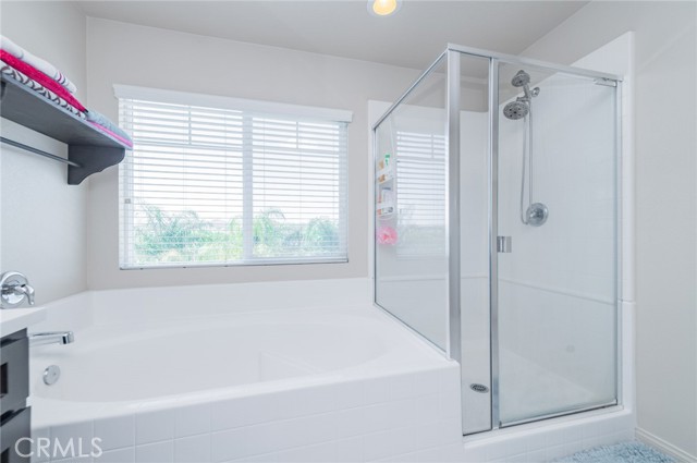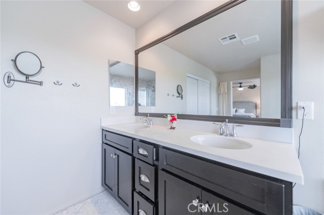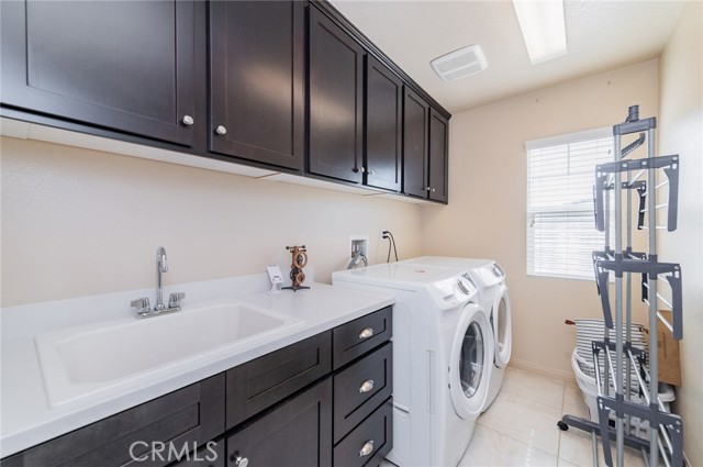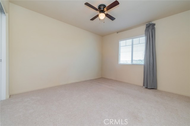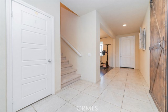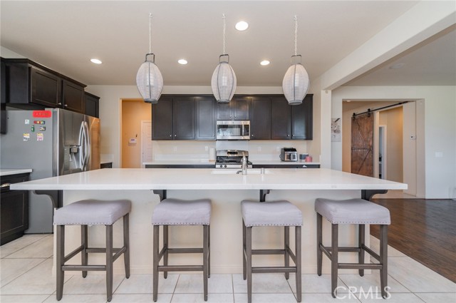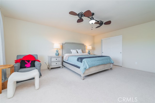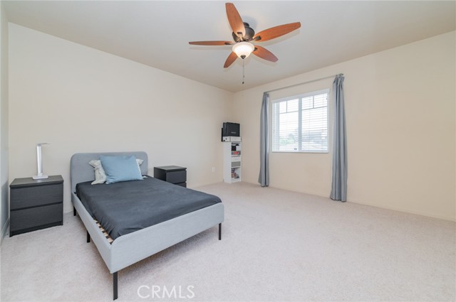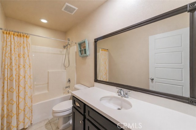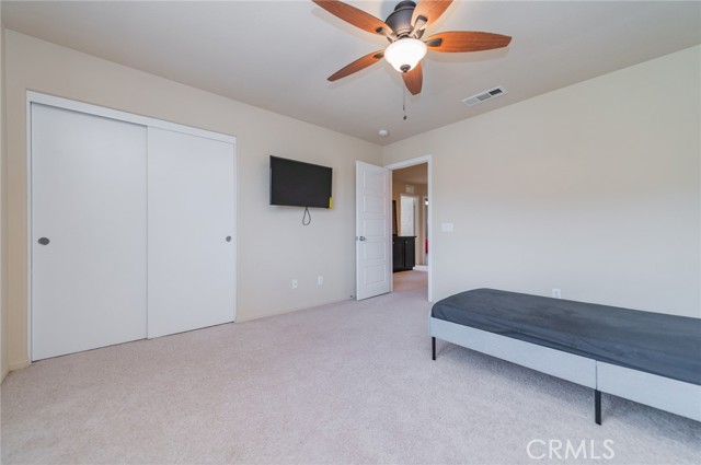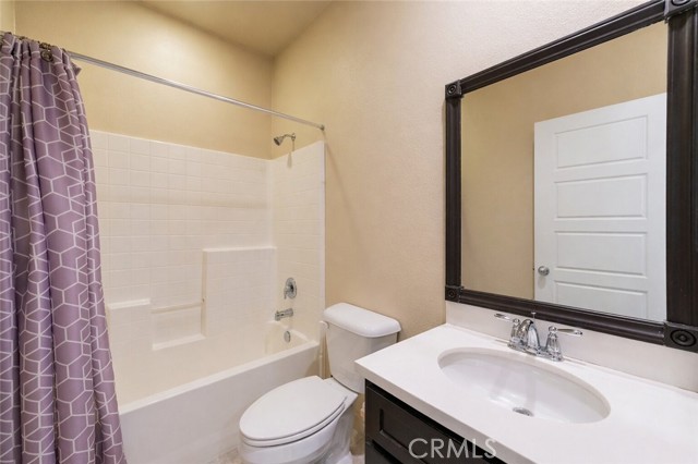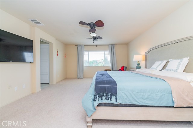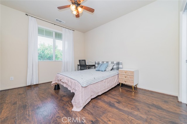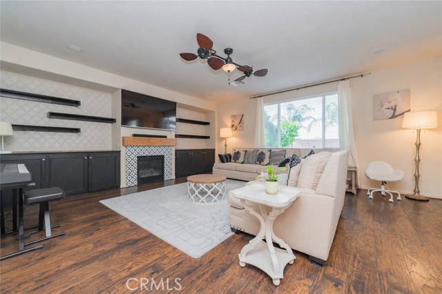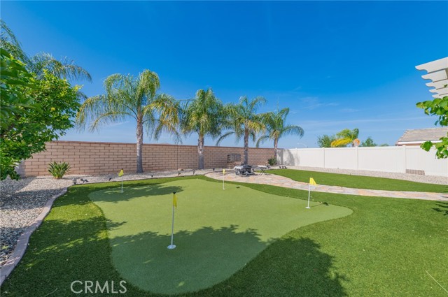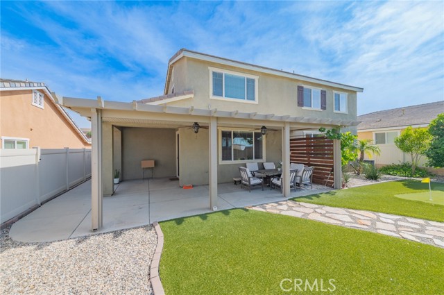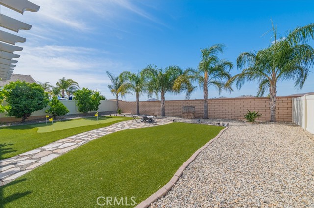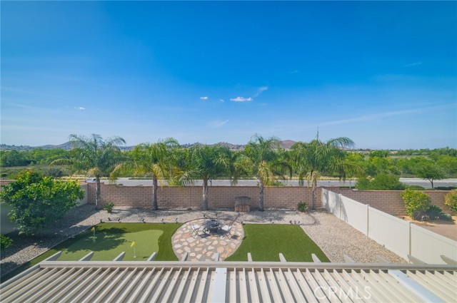 Former model home located at the end of a quiet cul-de-sac in Audie Murphy Ranch, Menifee, offering 5 bedrooms, 3 bathrooms, plus a bonus room office/den, with approximately 3,000 sq ft of upgraded living space on a 7,405 sq ft lot. The home features tall ceilings, fresh interior paint, and abundant natural light throughout. The main floor includes a flexible office/den space, a bedroom, and a full bathroom with tub/shower combo and custom barn door, ideal for guests or multigenerational living. The family room is appointed with laminate flooring, a custom fireplace with wood mantel, built-ins, and designer finishes. The open-concept kitchen boasts a large quartz island, extensive cabinetry, stainless steel appliances, a dining nook, walk-in pantry, and mudroom with direct access to the 3-car garage. Upstairs offers three spacious secondary bedrooms with mountain views and ceiling fans, a full secondary bathroom, and a dedicated laundry room with sink and storage. The primary suite features scenic mountain views, dual walk-in closets, dual vanities, a soaking tub, and separate shower. Additional upgrades include ceiling fans throughout, dimmer switches, motion-sensor lighting in bathrooms, and ample built-in and attic storage. The backyard offers privacy with no rear neighbors and is designed for entertaining, featuring a California room, Alumawood patio cover, flagstone hardscape, turf, fruit trees, and a private putting green, with plenty of space for a pool. Community amenities include pool, spa, sports courts, and clubhouse, with convenient access to the 15 and 215 freeways and close proximity to shopping, dining, and parks.