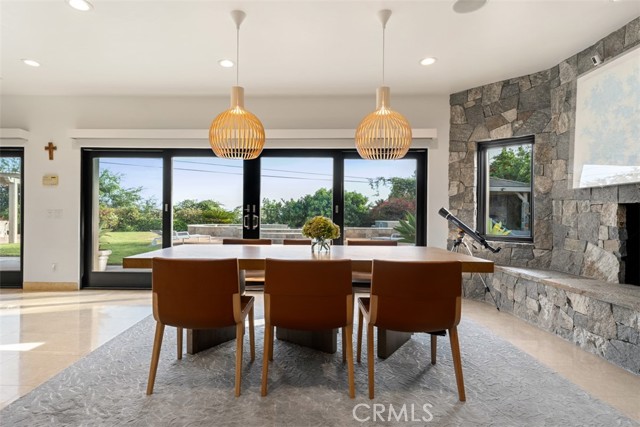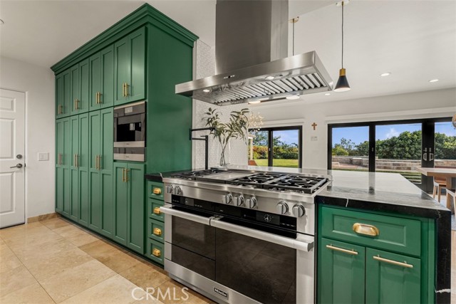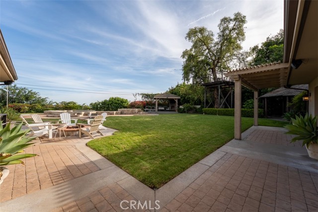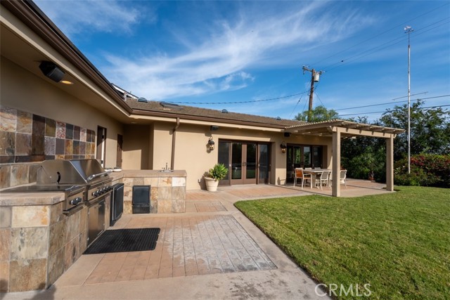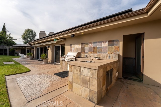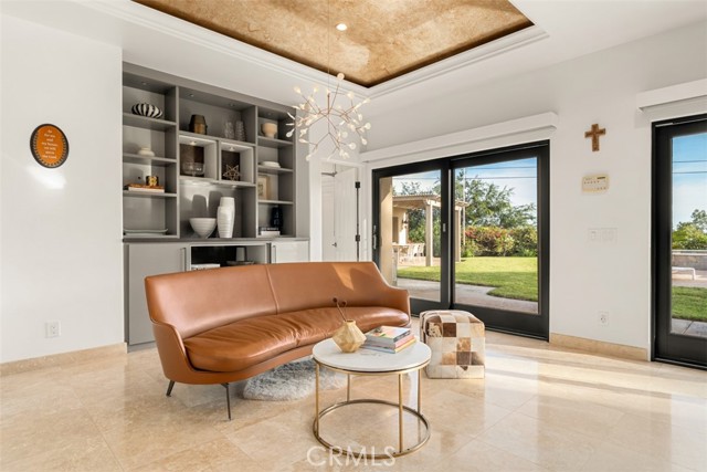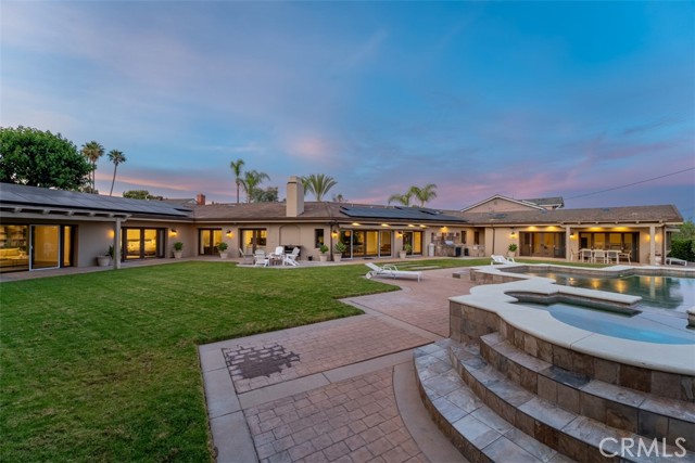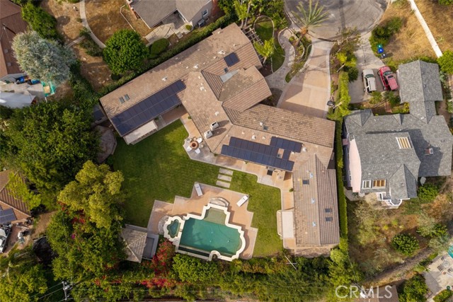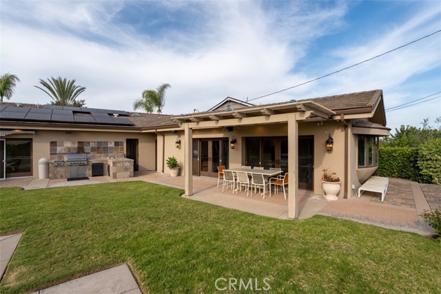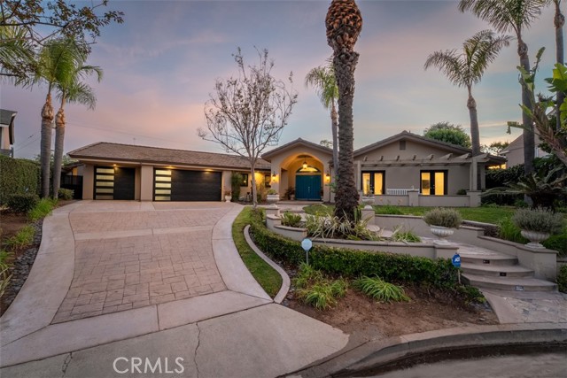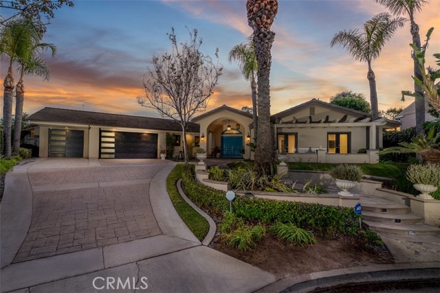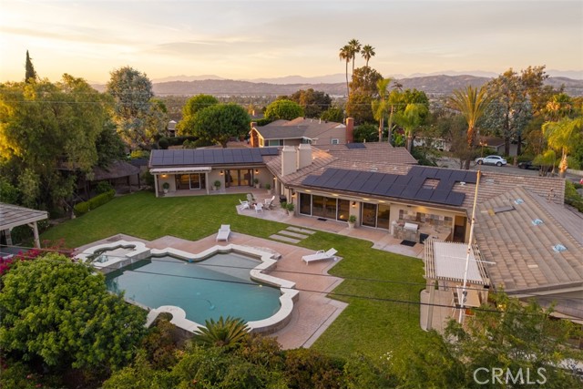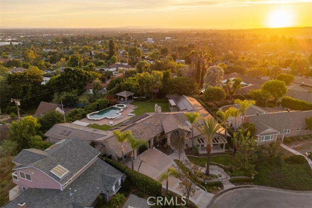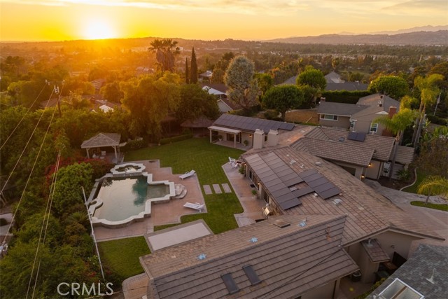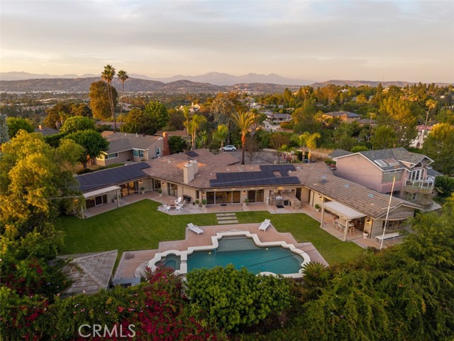 Welcome to a rare offering, a single level luxury estate located in Fullerton's most coveted enclave of custom built legacy homes. This residence blends refined architecture, premium finishes, & a layout designed for elegant living & upscale entertaining. Tucked at the corner of a private road cul-de-sac and exclusivity is apparent. The home features Andersen traditional French-style doors & windows, framing the home beautifully, inviting natural light, while maintaining exceptional energy efficiency. Natural travertine flooring extends throughout the main living areas, enhancing the homes organic palette & effortless indoor-outdoor flow. Bold, sophisticated & undeniably striking, the kitchen is a study of contrast & dimension. Dramatic black & white-veined marble paired w/ soft white & gray-veined quartz slab surfaces create a captivating visual interplay, while rich forest green cabinetry introduce depth & elegance. High grade Miele appliances reflect light with mirror like finish, adding a layer of modern refinement & performance-driven luxury, a kitchen that feels both artful and functional. Multiple seating and dining areas offers incredible flexibility for gathering, entertaining or enjoying everyday family moments. A seamless plaster wall finish present a refined, uninterrupted visual flow. The primary suite is truly its own retreat designed for calm comfort. The adjacent study is a standout feature, complete w/ custom shelving. Throughout the home, lighting is not merely functional, they are sculptural, whimsical, curated & thoughtfully placed acting as visual cues & layered ambiance. The secondary bedrooms & bathrooms are far from an afterthought. Bedrooms w/ wood floors & crown molding. Bathrooms w/ artfully selected tilework from floor to ceiling transform each space into a spa-like retreat. The guest suite generously scaled & beautifully appointed rival a luxury resort experience w/ a kitchenette & full bathroom. The outdoor living amenities is nothing short of spectacular. A heated infinity pool & spa is the centerpiece, a cabana, a hut & versatile gathering spaces surrounded by sweeping, picturesque views whether hosting or unwinding feels like a getaway. Integrated into the property is a fully owned 50-panel solar energy system delivering both efficiency & long term cost savings. Experience refined living in this beautifully rebuilt residence completed in 2002 & designed to offer the comfort of newer systems paired with timeless elegance.