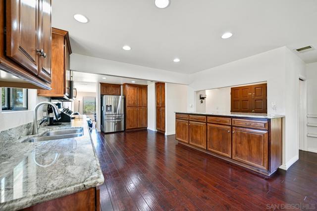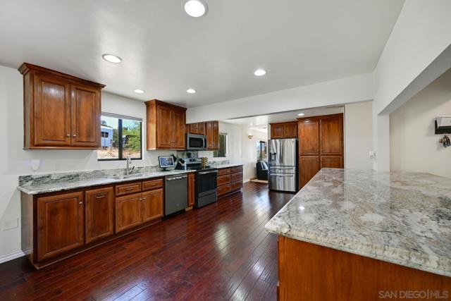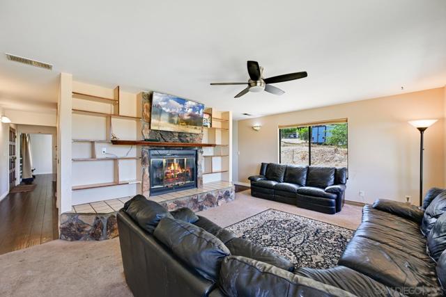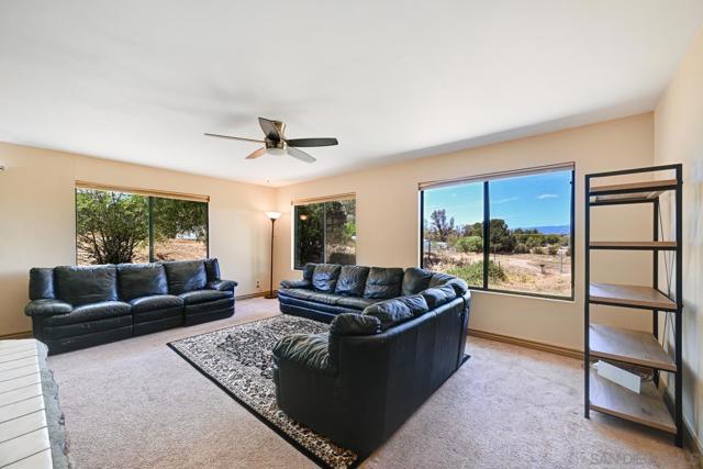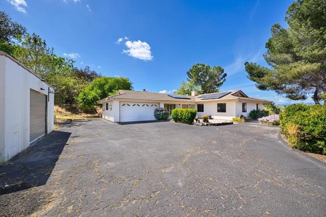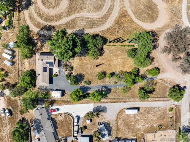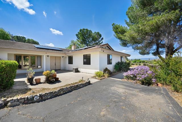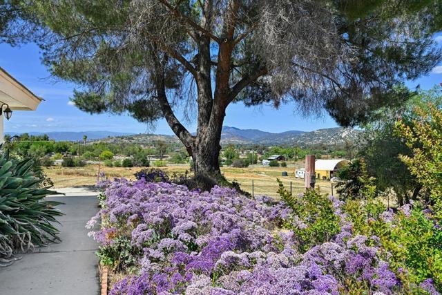 Set on a beautifully usable and expansive 1.23-acre flat parcel, this inviting property offers the perfect blend of privacy, functionality, and scenic charm. A long private driveway leads you to this fully fenced estate with a gated entry, ideally situated just off a paved road with convenient access to Highway 78 and close to town with nearby shops, restaurants, and grocery stores. The land is well suited for horse and animal enthusiasts, gardening, or creating your own grove, all while enjoying picturesque mountain and pasture views. The property also features charming grape vines and a chicken coop, adding to its appeal for those seeking a more self-sustained, country lifestyle. Thoughtfully improved, the property features RV parking, a metal workshop with 220 power, two storage sheds, and a leased solar system with a low monthly payment for added efficiency. The welcoming ranch-style home begins with a spacious front patio and flows into a foyer that opens to the dining area and an impressively large, renovated kitchen. This oversized kitchen is both stylish and functional, offering abundant cabinetry, a breakfast bar, pantry, recessed lighting, and stunning granite countertops—perfect for everyday living and entertaining. The dining room includes sliding doors to the backyard, while the family room features a cozy wood-burning fireplace with hearth, surrounded by built-ins. The primary suite offers a private bath, while two additional bedrooms share a well-appointed bathroom with dual sinks and a tub/shower combination. This home offers endless possibilities!