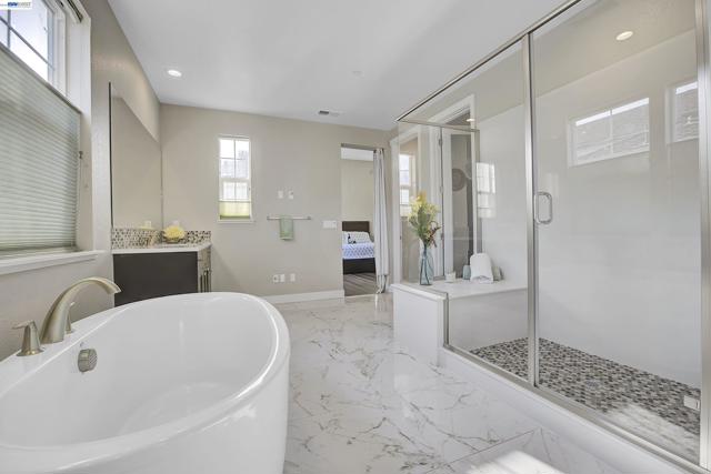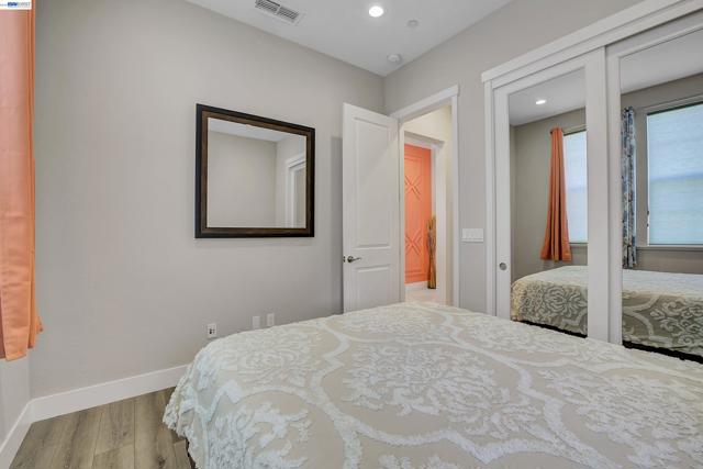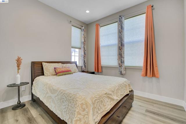 Designed for comfort and modern living, this North-facing home offers 4 spacious bedrooms, 3 full bathrooms, and approximately 2,476 sq. ft., thoughtfully aligned with Vaastu principles. The entry level features 1 bedroom and 1 full bath, ideal for guests or multigenerational living. Sun-filled interiors, expansive windows, and a versatile upstairs loft provide flexible living space. The open-concept Great Room showcases 10-ft ceilings, recessed lighting, oversized windows, and elegant bamboo blinds. The gourmet kitchen is the heart of the home, featuring granite countertops, a large island, subway tile backsplash, built-in microwave, wine storage, and a premium 6-burner Bertazzoni gas range—perfect for entertaining. Upstairs, the primary suite offers 11-ft ceilings and a spa-inspired bath with dual vanities, soaking tub, oversized shower, walk-in closet, and multi-directional blinds. Additional highlights include owned solar panels, dual-pane windows, and a tankless water heater. The finished 2-car garage features epoxy flooring, custom cabinetry, and an EV charging station. Enjoy a beautifully landscaped backyard with a paver patio—perfect for relaxing or entertaining. Enjoy the private backyard with a paver patio—perfect for relaxing or entertaining. Open House Sat/Sun 1 to 4