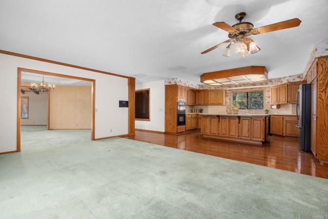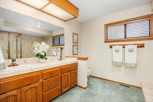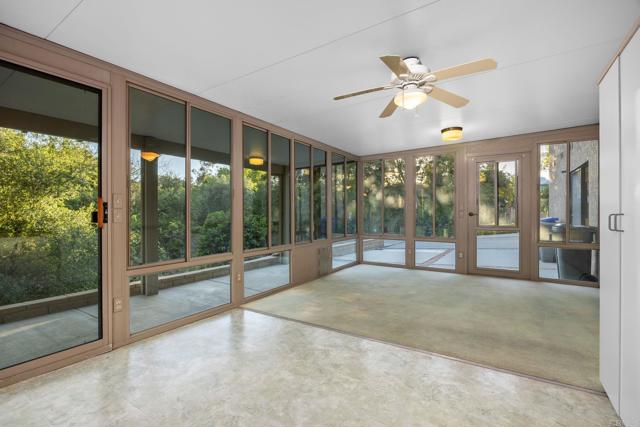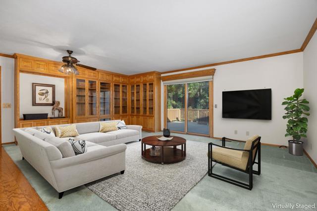 Set on an expansive private half acre lot, this extraordinary ranch-style home offers timeless character and remarkable flexibility. Built by the current owner in 1986 with quality finishes and thoughtful design, the home makes a memorable first impression with manicured landscaping, a circular driveway, mature trees, and a welcoming covered front porch. Inside, the formal entry opens to a spacious living room anchored by a gas fireplace with brick hearth and mantel, natural wood pitched ceilings, and windows that bring in beautiful light. The living room flows to a generous formal dining room, while a built-in library with pocket doors offers a quiet retreat or home office. The kitchen and family room are the heart of the home, connected in an open design ideal for everyday living and entertaining. The family room features built-in cabinetry, while the spacious kitchen offers a large center island with cooktop, beverage refrigerator, drawer microwave, double ovens, refrigerator, pantry, abundant storage, and a picture window overlooking the front yard and circular drive. Sliding doors extend this central living area to a large private balcony, creating true indoor-outdoor living surrounded by mature greenery. Beneath the balcony, a covered patio with an inground spa adds an additional outdoor retreat, complemented by garden areas, fruit trees, mature growth, and a creek tucked behind the home. The bedroom wing includes two secondary bedrooms, one with a built-in desk, a shared hallway bathroom, spacious laundry room, and a comfortable primary suite with walk-in closets and an ensuite bath with dual sinks, sunken tub, and step-in shower. Additional amenities include a powder room, mudroom with storage, two-car garage with cabinetry, and a whole-house water conditioner. Below the primary residence, the expansive basement functions as its own versatile secondary space. Not included in the listed livable area, this bonus level offers more than 1,600 square feet of workspace and storage, plus a refreshed game room, full bathroom, built-on sunroom, covered patio access, and a second driveway. Convenient to shopping, dining, parks, schools, and hiking trails, this one-of-a-kind property invites comfort, creativity, and possibility.